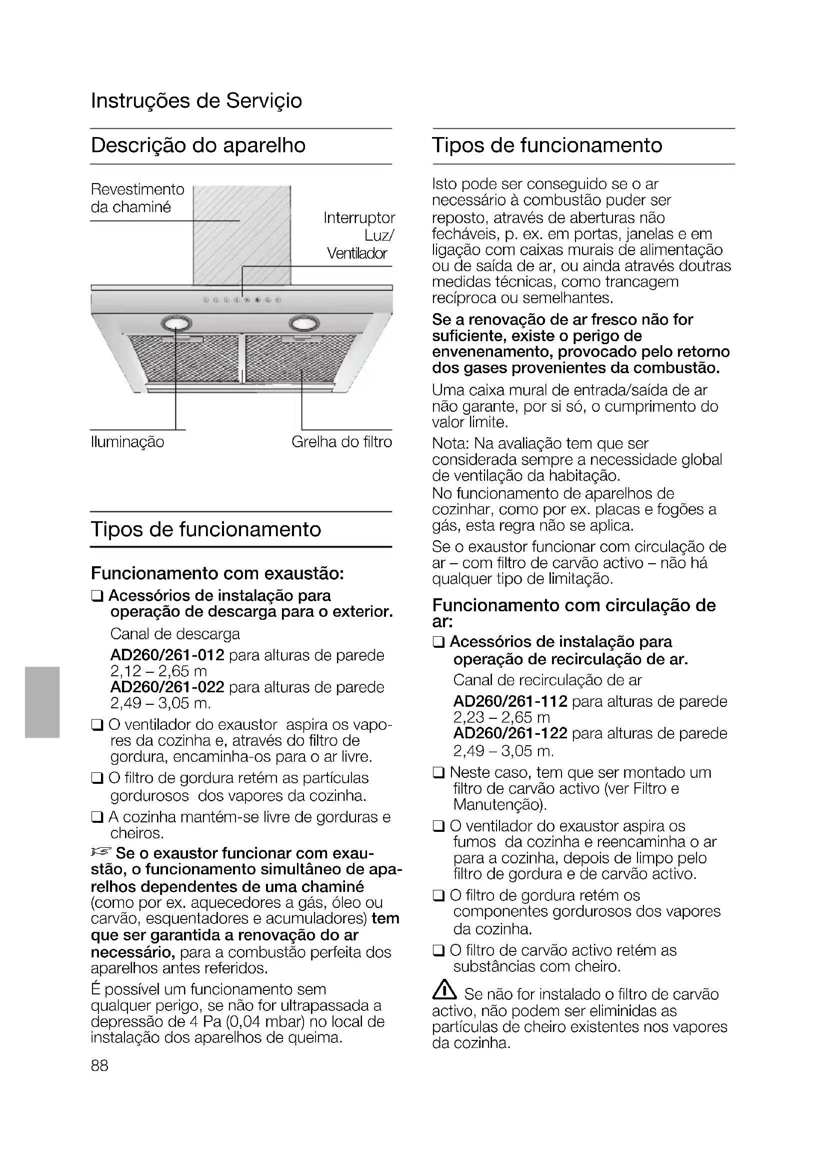 Descrição do aparelho Instruções de Serviçio Tipos de funcionamento Tipos de funcionamento Funcionamento com exaustão: ❑ Acessórios de instalação para operação de descarga para o exterior. Canal de descarga AD260/261-012 para alturas de parede 2,12 – 2,65 m AD260/261-022 para alturas de parede 2,49 – 3,05 m. ❑ O ventilador do exaustor aspira os vapo- res da cozinha e, através do filtro de gordura, encaminha-os para o ar livre. ❑ O filtro de gordura retém as partículas gordurosos dos vapores da cozinha. ❑ A cozinha mantém-se livre de gorduras e cheiros.