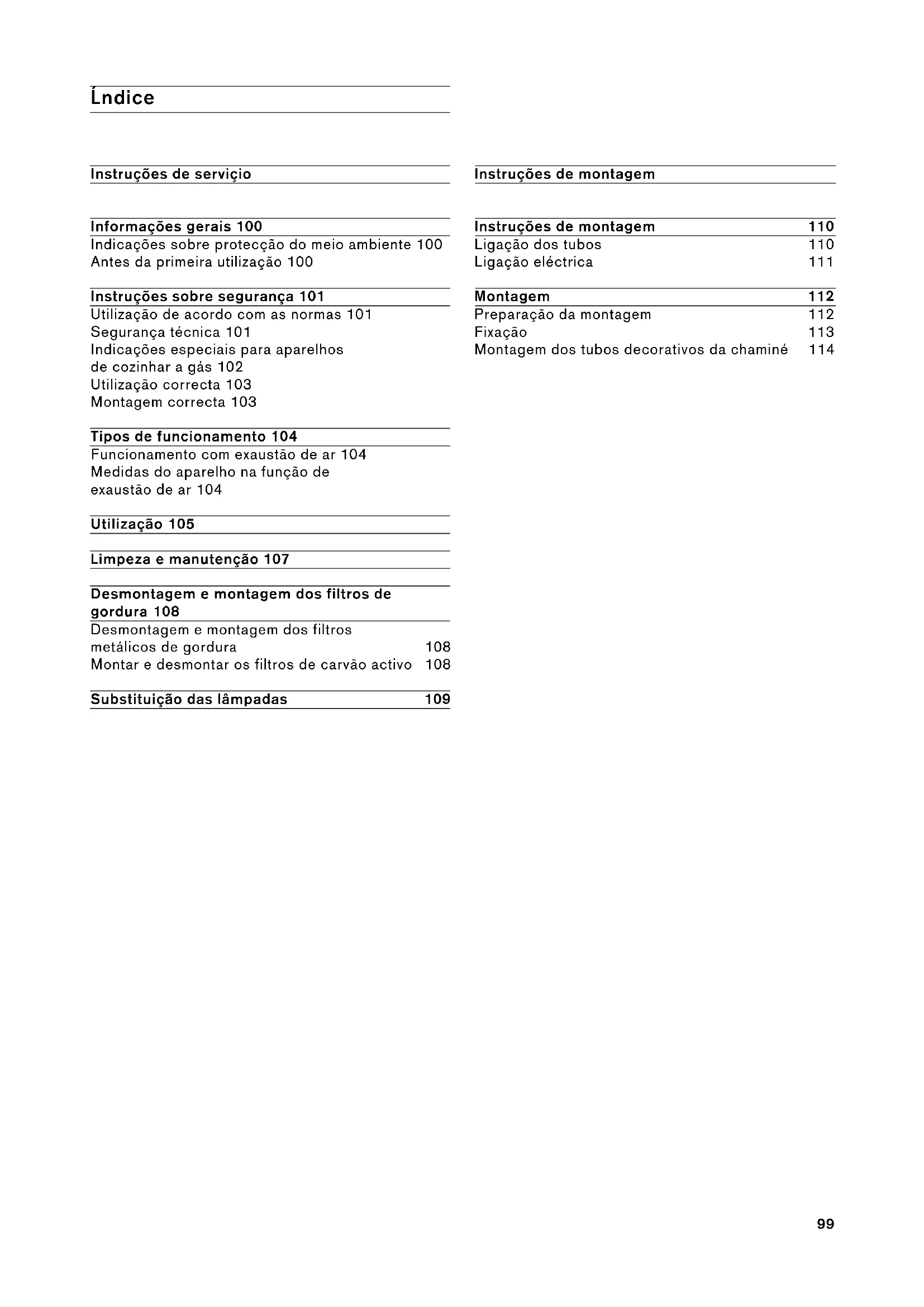 La cara interior de los elementos de revestimiento pueden bordes con rebabas (cortantes), resultantes del proceso de fabricación. Por ello se deberá efectuar el montaje utilizando guantes protectores. 1 Separar los elementos de revestimiento inferior, retirando a tal efecto la cinta adhesiva. 2 Retirar la lámina protectora de los dos módulos. 3 Apoyar los dos elementos de revestimiento superior sobre el cuerpo de la campana. ADVERTENCIA: Proteja la campana extractora contra posibles daños durante el montaje, evitando ocasionar rasguños en las superficies delicadas. 4 Deslizar el módulo superior hacia arriba y fijarlo con dos tornillos. 5 Colocar los dos elementos del módulo inferior y encajarlos.99 Instruções de serviçio Informações gerais 100 Indicações sobre protecção do meio ambiente 100 Antes da primeira utilização 100 Instruções sobre segurança 101 Utilização de acordo com as normas 101 Segurança técnica 101 Indicações especiais para aparelhos de cozinhar a gás 102 Utilização correcta 103 Montagem correcta 103 Tipos de funcionamento 104 Funcionamento com exaustão de ar 104 Medidas do aparelho na função de exaustão de ar 104 Utilização 105 Limpeza e manutenção 107 Desmontagem e montagem dos filtros de gordura 108 Desmontagem e montagem dos filtros metálicos de gordura 108 Montar e desmontar os filtros de carvão activo 108 Substituição das lâmpadas 109 Instruções de montagem Instruções de montagem 110 Ligação dos tubos 110 Ligação eléctrica 111 Montagem 112 Preparação da montagem 112 Fixação 113 Montagem dos tubos decorativos da chaminé 114 Ĺndice100 Indicações sobre protecção do meio ambiente Reciclagem da embalagem de transporte Até chegar a sua casa, o seu novo aparelho esteve protegido pela embalagem. Todos os materiais utilizados não prejudicam o meio ambiente e são reutilizáveis. Por favor, participe neste objectivo e proceda à reciclagem da embalagem sem prejudicar o ambiente.