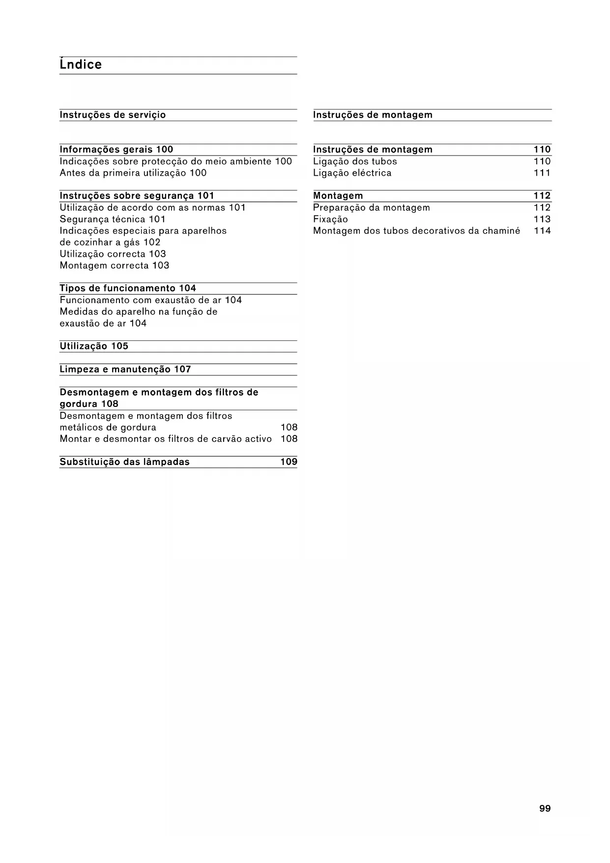 La cara interior de los elementos de revestimiento pueden bordes con rebabas (cortantes), resultantes del proceso de fabricación. Por ello se deberá efectuar el montaje utilizando guantes protectores. 1 Separar los elementos de revestimiento inferior, retirando a tal efecto la cinta adhesiva. 2 Retirar la lámina protectora de los dos módulos. 3 Apoyar los dos elementos de revestimiento superior sobre el cuerpo de la campana. ADVERTENCIA: Proteja la campana extractora contra posibles daños durante el montaje, evitando ocasionar rasguños en las superficies delicadas. 4 Deslizar el módulo superior hacia arriba y fijarlo con dos tornillos. 5 Colocar los dos elementos del módulo inferior y encajarlos.99 Instruções de serviçio Informações gerais 100 Indicações sobre protecção do meio ambiente 100 Antes da primeira utilização 100 Instruções sobre segurança 101 Utilização de acordo com as normas 101 Segurança técnica 101 Indicações especiais para aparelhos de cozinhar a gás 102 Utilização correcta 103 Montagem correcta 103 Tipos de funcionamento 104 Funcionamento com exaustão de ar 104 Medidas do aparelho na função de exaustão de ar 104 Utilização 105 Limpeza e manutenção 107 Desmontagem e montagem dos filtros de gordura 108 Desmontagem e montagem dos filtros metálicos de gordura 108 Montar e desmontar os filtros de carvão activo 108 Substituição das lâmpadas 109 Instruções de montagem Instruções de montagem 110 Ligação dos tubos 110 Ligação eléctrica 111 Montagem 112 Preparação da montagem 112 Fixação 113 Montagem dos tubos decorativos da chaminé 114 Ĺndice100 Indicações sobre protecção do meio ambiente Reciclagem da embalagem de transporte Até chegar a sua casa, o seu novo aparelho esteve protegido pela embalagem. Todos os materiais utilizados não prejudicam o meio ambiente e são reutilizáveis. Por favor, participe neste objectivo e proceda à reciclagem da embalagem sem prejudicar o ambiente.