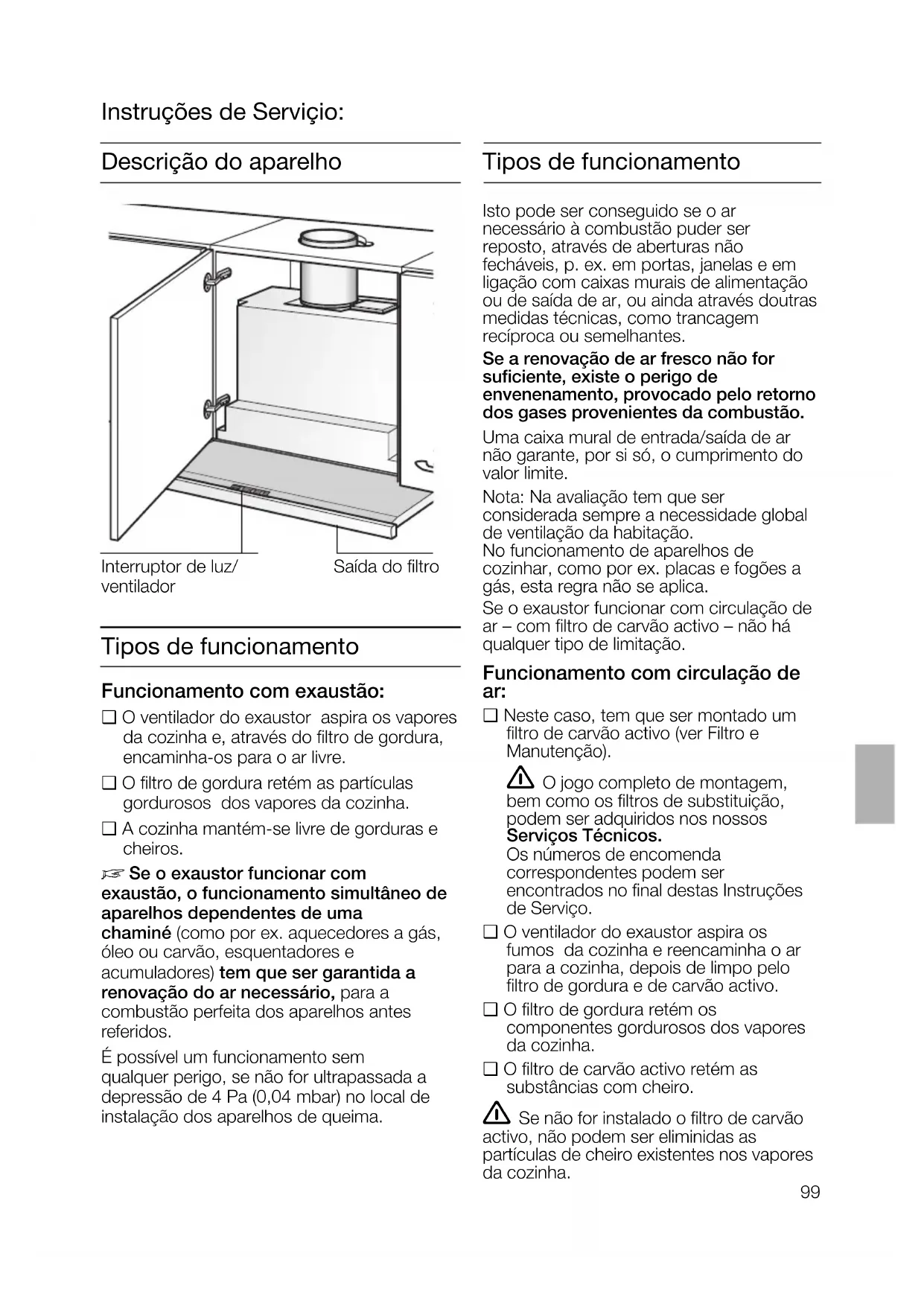 La campana extractora tiene que estar acoplada a la red eléctrica, pero desconectada.99 Tipos de funcionamento Isto pode ser conseguido se o ar necessário à combustão puder ser reposto, através de aberturas não fecháveis, p. ex. em portas, janelas e em ligação com caixas murais de alimentação ou de saída de ar, ou ainda através doutras medidas técnicas, como trancagem recíproca ou semelhantes. Se a renovação de ar fresco não for suficiente, existe o perigo de envenenamento, provocado pelo retorno dos gases provenientes da combustão. Uma caixa mural de entrada/saída de ar não garante, por si só, o cumprimento do valor limite. Nota: Na avaliação tem que ser considerada sempre a necessidade global de ventilação da habitação. No funcionamento de aparelhos de cozinhar, como por ex. placas e fogões a gás, esta regra não se aplica. Se o exaustor funcionar com circulação de ar – com filtro de carvão activo – não há qualquer tipo de limitação. Funcionamento com circulação de ar: ❑ Neste caso, tem que ser montado um filtro de carvão activo (ver Filtro e Manutenção). O jogo completo de montagem, bem como os filtros de substituição, podem ser adquiridos nos nossos Serviços Técnicos. Os números de encomenda correspondentes podem ser encontrados no final destas Instruções de Serviço. ❑ O ventilador do exaustor aspira os fumos da cozinha e reencaminha o ar para a cozinha, depois de limpo pelo filtro de gordura e de carvão activo. ❑ O filtro de gordura retém os componentes gordurosos dos vapores da cozinha. ❑ O filtro de carvão activo retém as substâncias com cheiro. Se não for instalado o filtro de carvão activo, não podem ser eliminidas as partículas de cheiro existentes nos vapores da cozinha. Interruptor de luz/ ventilador Saída do filtro Descrição do aparelho Instruções de Serviçio: Tipos de funcionamento Funcionamento com exaustão: ❑ O ventilador do exaustor aspira os vapores da cozinha e, através do filtro de gordura, encaminha-os para o ar livre. ❑ O filtro de gordura retém as partículas gordurosos dos vapores da cozinha. ❑ A cozinha mantém-se livre de gorduras e cheiros.