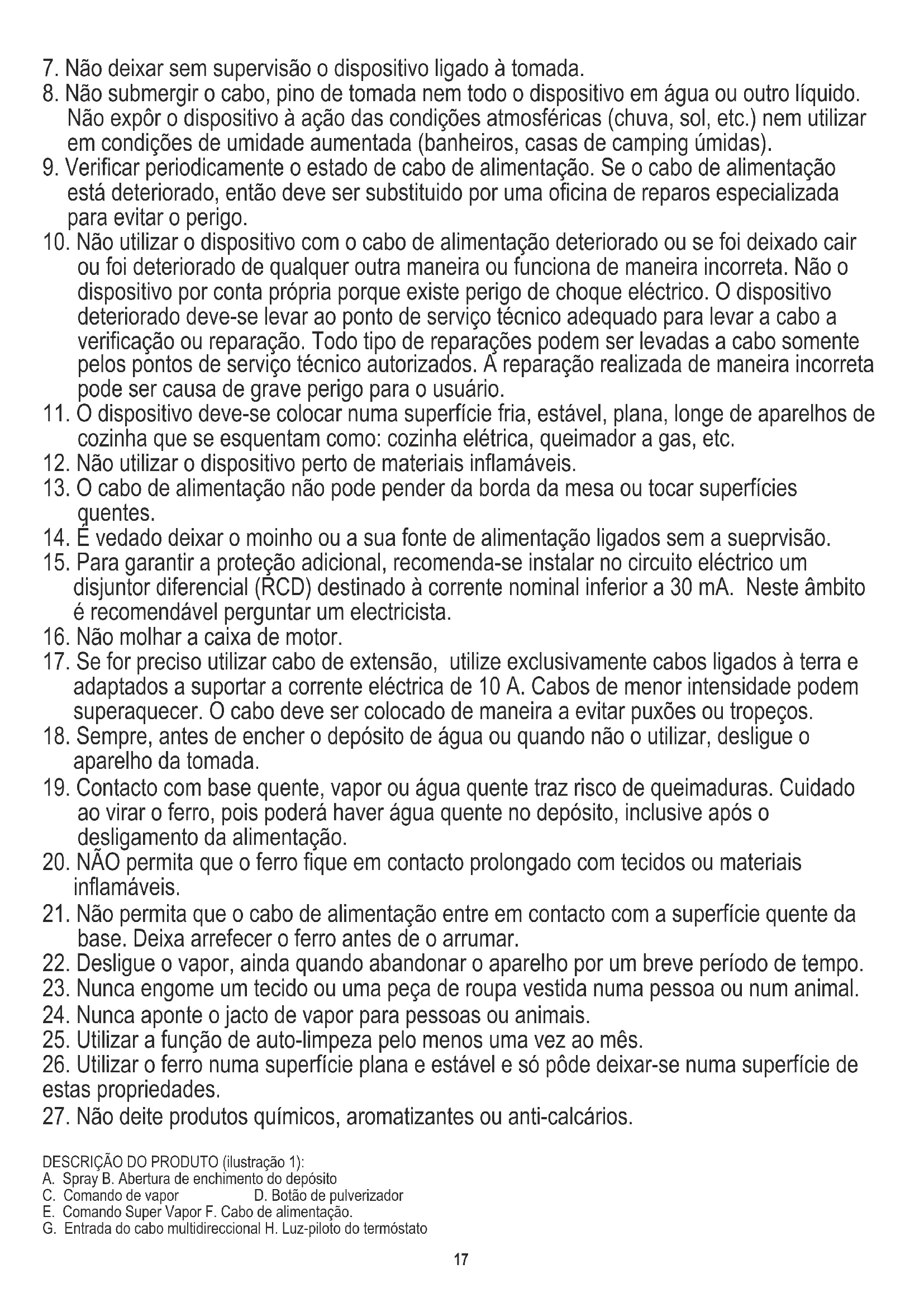 DESCRIÇÃO DO PRODUTO (ilustração 1): A. Spray B. Abertura de enchimento do depósito C. Comando de vapor D. Botão de pulverizador E. Comando Super Vapor F. Cabo de alimentação. G. Entrada do cabo multidireccional H. Luz-piloto do termóstato18