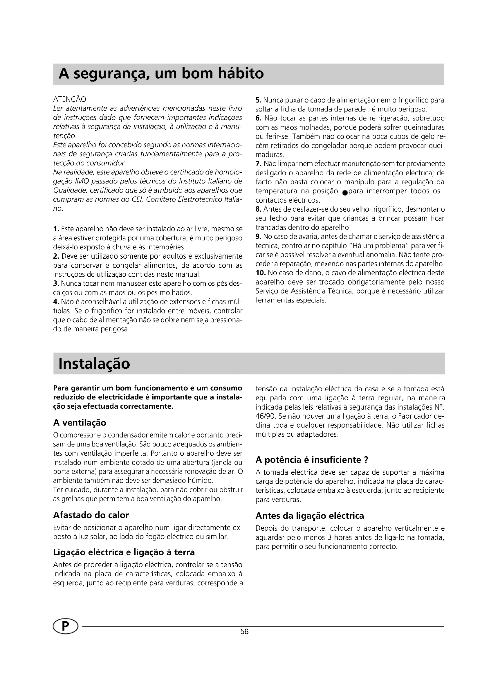 tiplas. Se o frigorífico for instalado entre móveis, controlar que o cabo de alimentação não se dobre nem seja pressiona- do de maneira perigosa. Para garantir um bom funcionamento e um consumo reduzido de electricidade é importante que a instala- ção seja efectuada correctamente. A ventilação O compressor e o condensador emitem calor e portanto preci- sam de uma boa ventilação. São pouco adequados os ambien- tes com ventilação imperfeita. Portanto o aparelho deve ser instalado num ambiente dotado de uma abertura (janela ou porta externa) para assegurar a necessária renovação de ar. O ambiente também não deve ser demasiado húmido. Ter cuidado, durante a instalação, para não cobrir ou obstruir as grelhas que permitem a boa ventilação do aparelho. Afastado do calor Evitar de posicionar o aparelho num ligar directamente ex- posto à luz solar, ao lado do fogão eléctrico ou similar. Ligação eléctrica e ligação à terra Antes de proceder à ligação eléctrica, controlar se a tensão indicada na placa de características, colocada embaixo à esquerda, junto ao recipiente para verduras, corresponde a tensão da instalação eléctrica da casa e se a tomada está equipada com uma ligação à terra regular, na maneira indicada pelas leis relativas à segurança das instalações N°. 46/90. Se não houver uma ligação à terra, o Fabricador de- clina toda e qualquer responsabilidade. Não utilizar fichas múltiplas ou adaptadores. A potência é insuficiente ? A tomada eléctrica deve ser capaz de suportar a máxima carga de potência do aparelho, indicada na placa de carac- terísticas, colocada embaixo à esquerda, junto ao recipiente para verduras. Antes da ligação eléctrica Depois do transporte, colocar o aparelho verticalmente e aguardar pelo menos 3 horas antes de ligá-lo na tomada, para permitir o seu funcionamento correcto. Instalação57