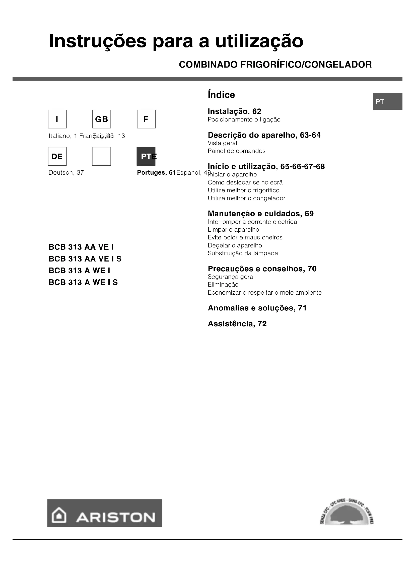 Instruções para a utilização Índice Instalação, 62 Posicionamento e ligação Descrição do aparelho, 63-64 Vista geral Painel de comandos Início e utilização, 65-66-67-68 Iniciar o aparelho Como deslocar-se no ecrã Utilize melhor o frigorífico Utilize melhor o congelador Manutenção e cuidados, 69 Interromper a corrente eléctrica Limpar o aparelho Evite bolor e maus cheiros Degelar o aparelho Substituição da lâmpada Precauções e conselhos, 70 Segurança geral Eliminação Economizar e respeitar o meio ambiente Anomalias e soluções, 71 Assistência, 72 Italiano, 1 Français,25 Deutsch, 37 English, 13