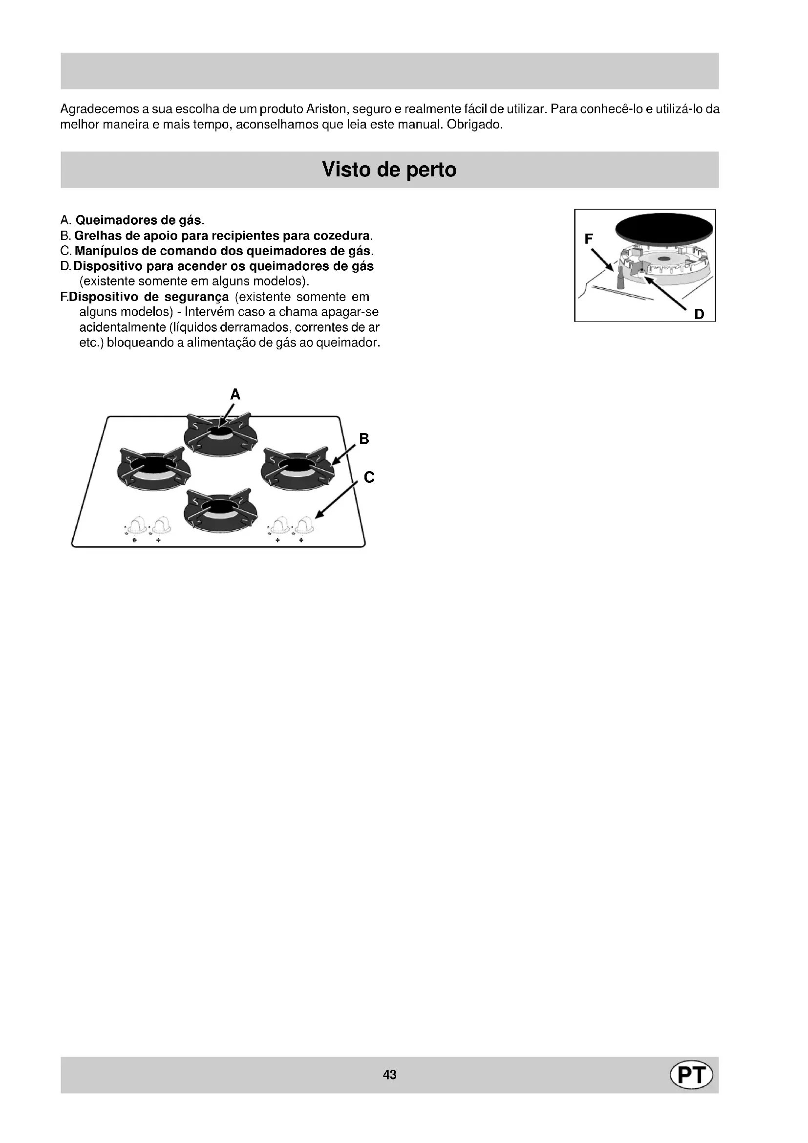 SR43 Agradecemos a sua escolha de um produto Ariston, seguro e realmente fácil de utilizar. Para conhecê-lo e utilizá-lo da melhor maneira e mais tempo, aconselhamos que leia este manual. Obrigado. Visto de perto A. Queimadores de gás. B. Grelhas de apoio para recipientes para cozedura. C. Manípulos de comando dos queimadores de gás. D. Dispositivo para acender os queimadores de gás (existente somente em alguns modelos). F. Dispositivo de segurança (existente somente em alguns modelos) - Intervém caso a chama apagar-se acidentalmente (líquidos derramados, correntes de ar etc.) bloqueando a alimentação de gás ao queimador.