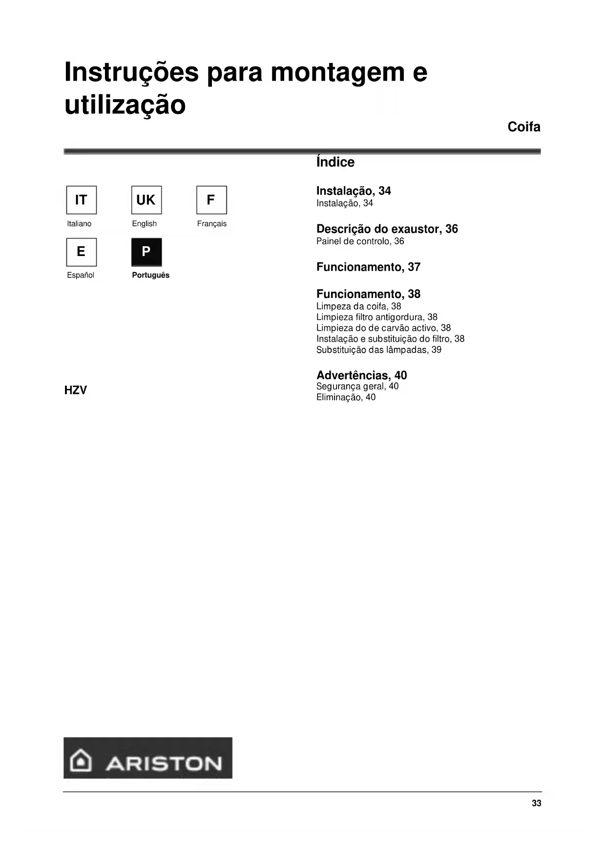 HZV Índice Instalação, 34 Instalação, 34 Descrição do exaustor, 36 Painel de controlo, 36 Funcionamento, 37 Funcionamento, 38 Limpeza da coifa, 38 Limpieza filtro antigordura, 38 Limpieza do de carvão activo, 38 Instalação e substituição do filtro, 38 Substituição das lâmpadas, 39 Advertências, 40 Segurança geral, 40 Eliminação, 4034