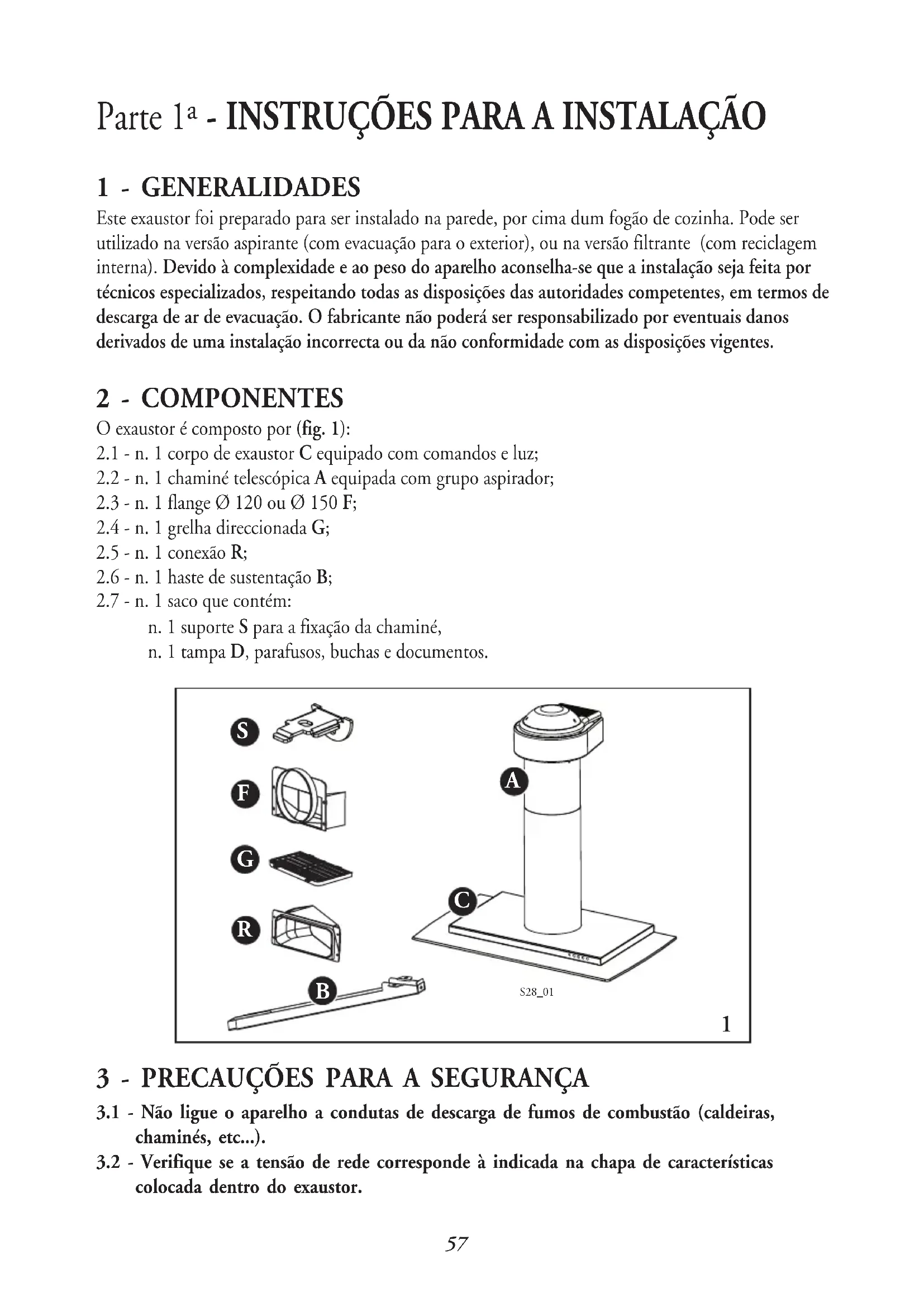 Este exaustor foi preparado para ser instalado na parede, por cima dum fogão de cozinha. Pode ser utilizado na versão aspirante (com evacuação para o exterior), ou na versão filtrante (com reciclagem interna). Devido à complexidade e ao peso do aparelho aconselha-se que a instalação seja feita por técnicos especializados, respeitando todas as disposições das autoridades competentes, em termos de descarga de ar de evacuação. O fabricante não poderá ser responsabilizado por eventuais danos derivados de uma instalação incorrecta ou da não conformidade com as disposições vigentes.