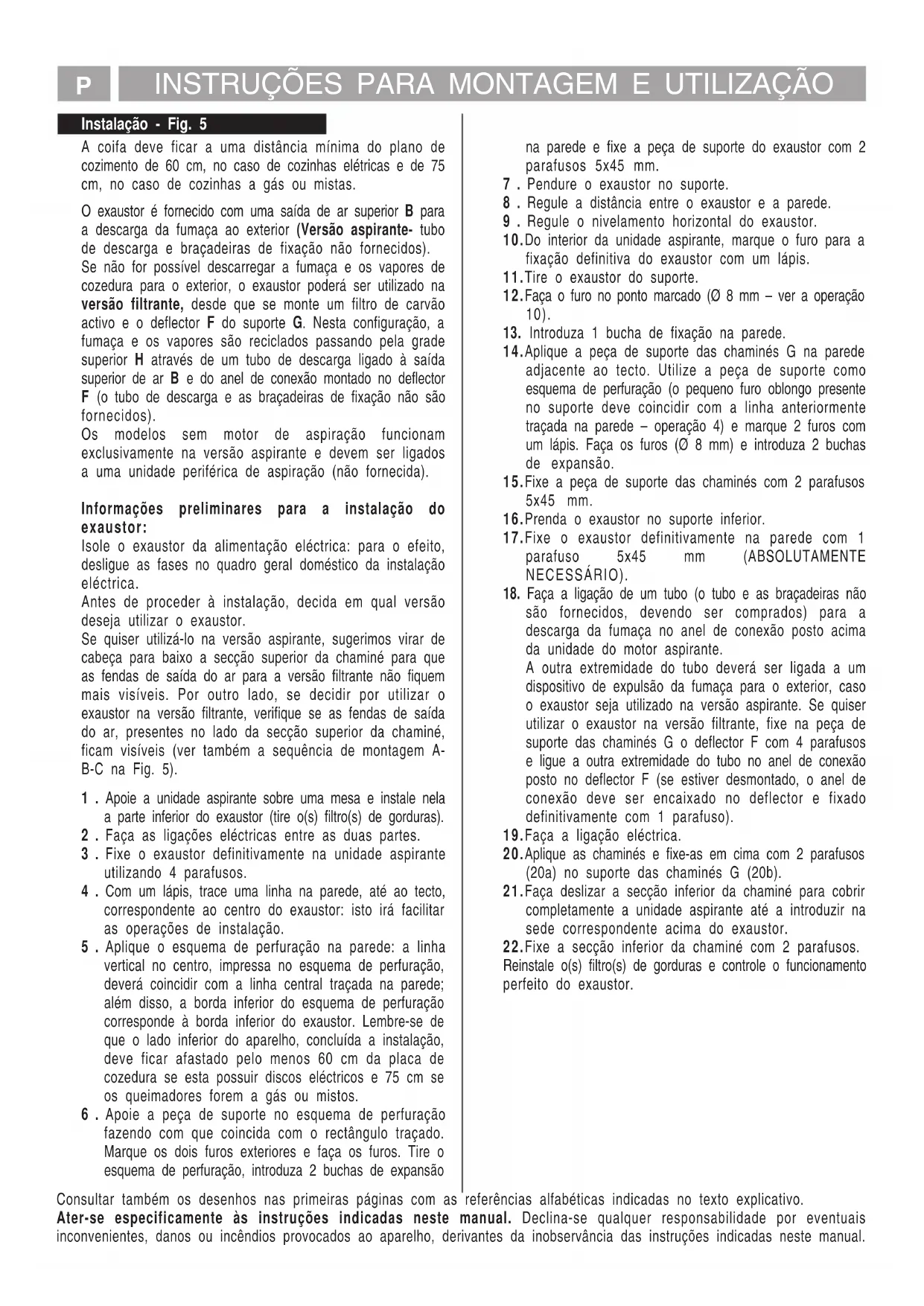 Consulte tambien los dibujos de las primeras páginas con las referencias alfabéticas del texto explicativo. Aténgase estrictamente a las instrucciones del presente manual. Se declina cada responsabilidad por eventuales inconvenientes, daños o incendios provocados al aparato originados por la inobservancia de las instrucciones colocadas en este manual. EInstalação - Fig. 5 A coifa deve ficar a uma distância mínima do plano de cozimento de 60 cm, no caso de cozinhas elétricas e de 75 cm, no caso de cozinhas a gás ou mistas. O exaustor é fornecido com uma saída de ar superior B para a descarga da fumaça ao exterior (Versão aspirante- tubo de descarga e braçadeiras de fixação não fornecidos). Se não for possível descarregar a fumaça e os vapores de cozedura para o exterior, o exaustor poderá ser utilizado na versão filtrante, desde que se monte um filtro de carvão activo e o deflector F do suporte G. Nesta configuração, a fumaça e os vapores são reciclados passando pela grade superior H através de um tubo de descarga ligado à saída superior de ar B e do anel de conexão montado no deflector F (o tubo de descarga e as braçadeiras de fixação não são fornecidos). Os modelos sem motor de aspiração funcionam exclusivamente na versão aspirante e devem ser ligados a uma unidade periférica de aspiração (não fornecida). Informações preliminares para a instalação do exaustor: Isole o exaustor da alimentação eléctrica: para o efeito, desligue as fases no quadro geral doméstico da instalação eléctrica. Antes de proceder à instalação, decida em qual versão deseja utilizar o exaustor. Se quiser utilizá-lo na versão aspirante, sugerimos virar de cabeça para baixo a secção superior da chaminé para que as fendas de saída do ar para a versão filtrante não fiquem mais visíveis. Por outro lado, se decidir por utilizar o exaustor na versão filtrante, verifique se as fendas de saída do ar, presentes no lado da secção superior da chaminé, ficam visíveis (ver também a sequência de montagem A- B-C na Fig. 5). 1 . Apoie a unidade aspirante sobre uma mesa e instale nela a parte inferior do exaustor (tire o(s) filtro(s) de gorduras). 2 . Faça as ligações eléctricas entre as duas partes. 3 . Fixe o exaustor definitivamente na unidade aspirante utilizando 4 parafusos. 4 . Com um lápis, trace uma linha na parede, até ao tecto, correspondente ao centro do exaustor: isto irá facilitar as operações de instalação. 5 . Aplique o esquema de perfuração na parede: a linha vertical no centro, impressa no esquema de perfuração, deverá coincidir com a linha central traçada na parede; além disso, a borda inferior do esquema de perfuração corresponde à borda inferior do exaustor. Lembre-se de que o lado inferior do aparelho, concluída a instalação, deve ficar afastado pelo menos 60 cm da placa de cozedura se esta possuir discos eléctricos e 75 cm se os queimadores forem a gás ou mistos. 6 . Apoie a peça de suporte no esquema de perfuração fazendo com que coincida com o rectângulo traçado. Marque os dois furos exteriores e faça os furos. Tire o esquema de perfuração, introduza 2 buchas de expansão na parede e fixe a peça de suporte do exaustor com 2 parafusos 5x45 mm. 7 . Pendure o exaustor no suporte. 8 . Regule a distância entre o exaustor e a parede. 9 . Regule o nivelamento horizontal do exaustor. 10.Do interior da unidade aspirante, marque o furo para a fixação definitiva do exaustor com um lápis. 11.Tire o exaustor do suporte. 12.Faça o furo no ponto marcado (Ø 8 mm – ver a operação 10).