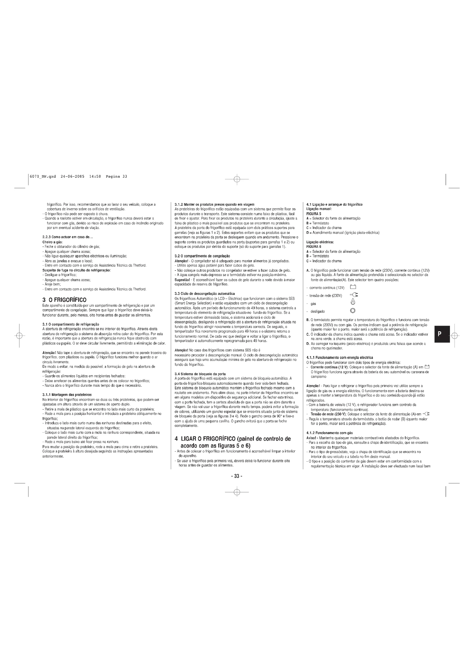 Manuel de instruções 6071_BW.qxd 24-06-2005 14:58 Pagina 32frigorífico. Por isso, recomendamos que ao lavar o seu veículo, coloque a cobertura de inverno sobre os orifícios de ventilação. - O frigorífico não pode ser exposto à chuva. - Quando a roulotte estiver em circulação, o frigorífico nunca deverá estar a funcionar com gás, devido ao risco de explosão em caso de incêndio originado por um eventual acidente de viação.