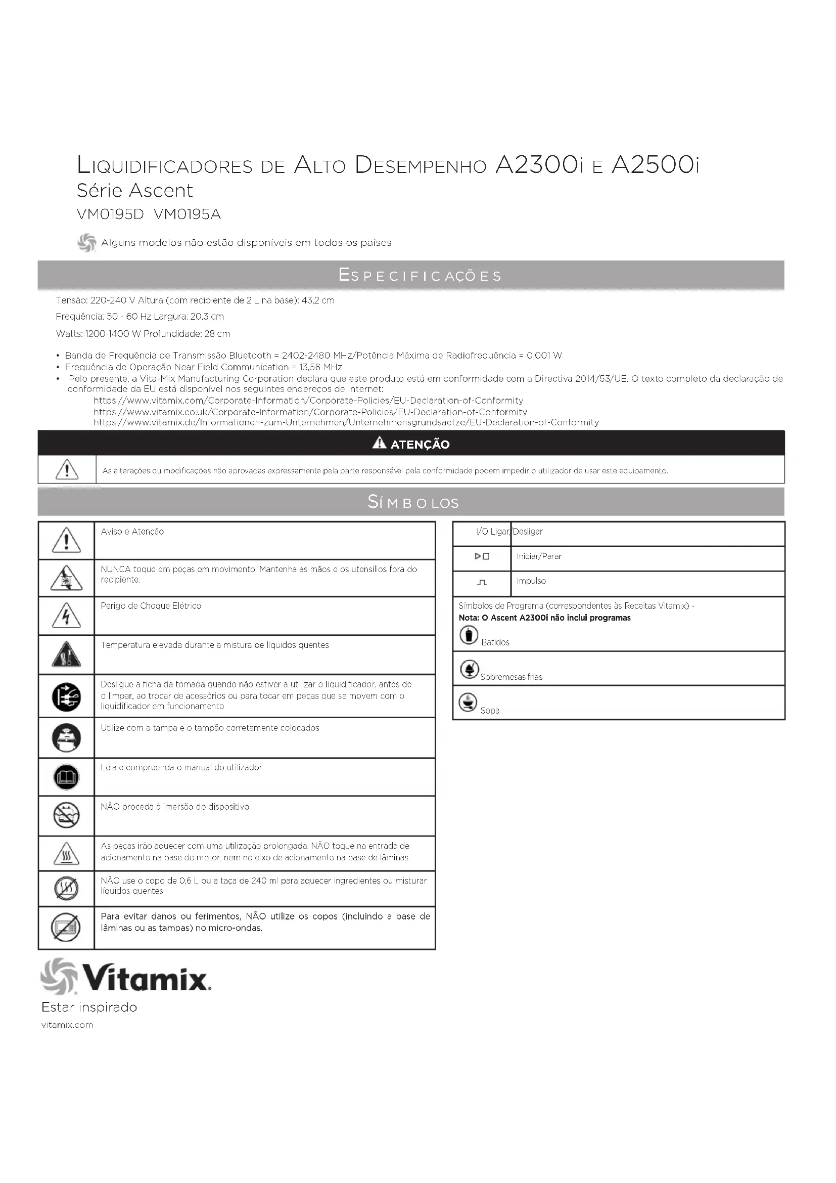 - Pelo presente, a Vita-Mix Manufacturing Corporation declara que este produto está em conformidade com a Directiva 2014/53/UE. O texto completo da declaração de conformidade da EU está disponível nos seguintes endereços de Internet: https://www.vitamix.com/Corporate-Information/Corporate-Policies/EU-Declaration-of-Conformity https://www.vitamix.co.uk/Corporate-Information/Corporate-Policies/EU-Declaration-of-Conformity https://www.vitamix.de/Informationen-zum-Unternehmen/Unternehmensgrundsaetze/EU-Declaration-of-Conformity I/O Ligar/Desligar Iniciar/PararImpulsoSímbolos de Programa (correspondentes às Receitas Vitamix) - Nota: O Ascent A2300i não inclui programas Batidos Sobremesas frias Sopa VM0195D VM0195A Alguns modelos não estão disponíveis em todos os países Estar inspirado vitamix.com ATENÇÃO As alterações ou modificações não aprovadas expressamente pela parte responsável pela conformidade podem impedir o utilizador de usar este equipamento.42 in Struçõ e S importa n t e S pa r a u m a ut i l i z ação Se g u r a AVISO: Para evitar o risco de ferimentos graves ao utilizar o seu liquidificador Vitamix®, deve seguir precauções de segurança básicas, incluindo as que se seguem. LEIA TODAS AS INSTRUÇÕES, MEDIDAS DE SEGURANÇA E AVISOS ANTES DE UTILIZAR O LIQUIDIFICADOR.INSTRUÇÕES IMPORTANTES PARA UMA UTILIZAÇÃO SEGURA Este produto destina-se APENAS À UTILIZAÇÃO DOMÉSTICA e não a efeitos comerciais. Não deixe o seu liquidificador Vitamix sem vigilância quando em funcionamento. Qualquer reparação, manutenção ou substituição de peças deve ser realizada pela Vitamix ou por um representante de serviço autorizado da Vitamix. OBSERVAÇÃO: O NÃO CUMPRIMENTO DE QUALQUER UMA DAS MEDIDAS DE SEGURANÇA IMPORTANTES E INSTRUÇÕES IMPORTANTES PARA A UTILIZAÇÃO SEGURA REPRESENTA UMA UTILIZAÇÃO INCORRETA DO SEU LIQUIDIFICADOR VITAMIX QUE PODE ANULAR A SUA GARANTIA E CRIAR O RISCO DE FERIMENTOS GRAVES.