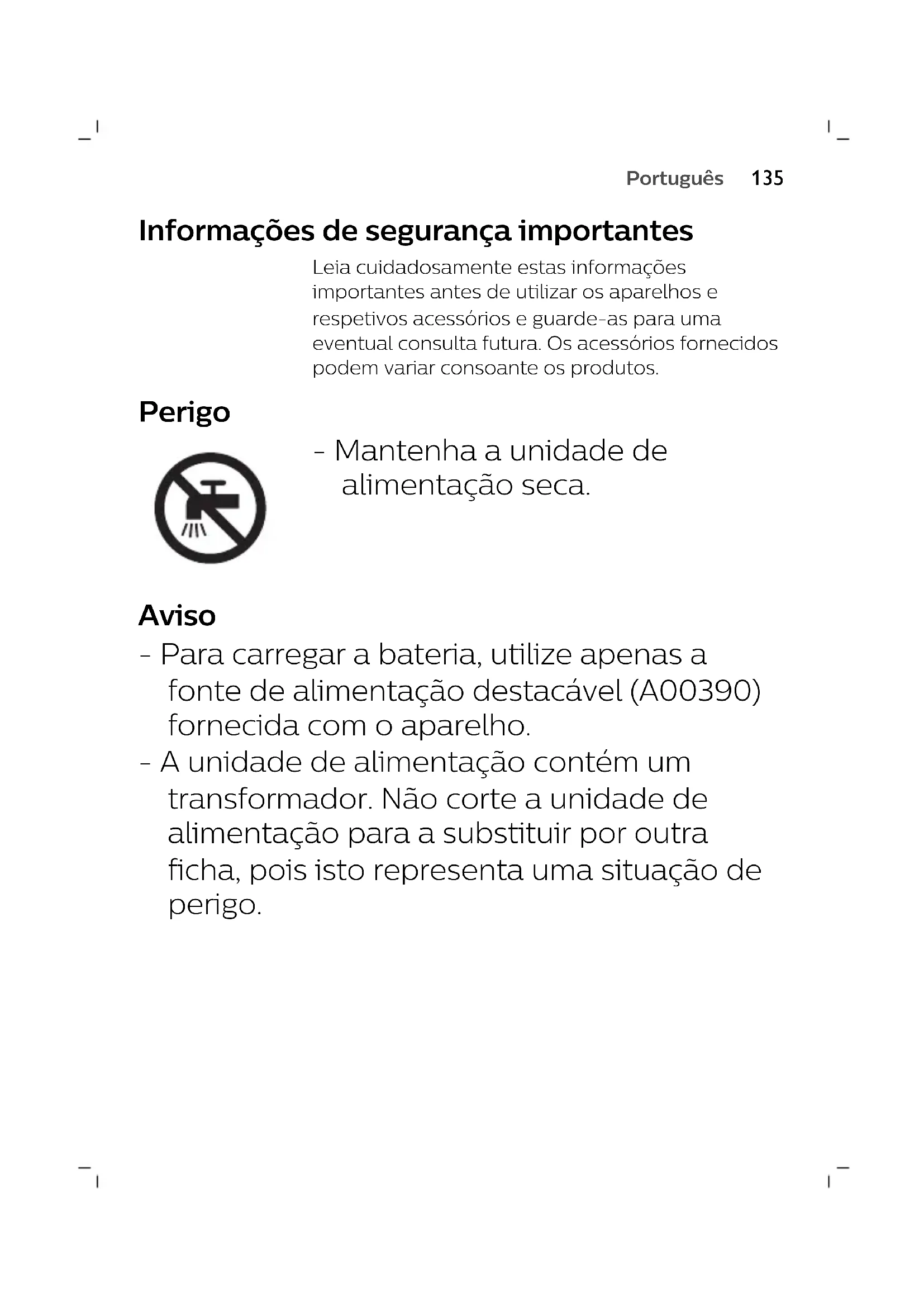 PortuguêsInformações de segurança importantes Leia cuidadosamente estas informações importantes antes de utilizar os aparelhos e respetivos acessórios e guarde-as para uma eventual consulta futura. Os acessórios fornecidos podem variar consoante os produtos. Perigo - Mantenha a unidade de alimentação seca. Aviso - Para carregar a bateria, utilize apenas a fonte de alimentação destacável (A00390) fornecida com o aparelho. - A unidade de alimentação contém um transformador. Não corte a unidade de alimentação para a substituir por outra ficha, pois isto representa uma situação de perigo.