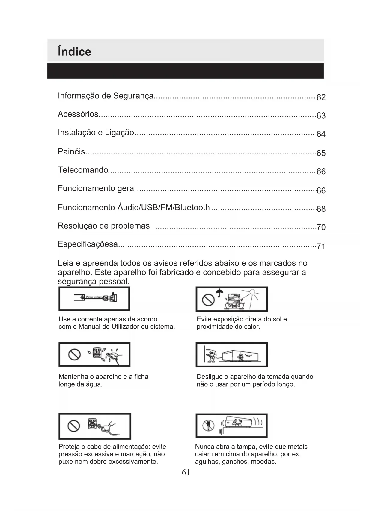 /AUX IN/USB PARA REPRODUÇÃO E CARREGAMENTO T180L BTÍndice Informação de Segurança...................................................................... Acessórios......................... Instalação e Ligação Painéis Telecomando Funcionamento geral Funcionamento Áudio/USB/FM/Bluetooth Resolução de problemas