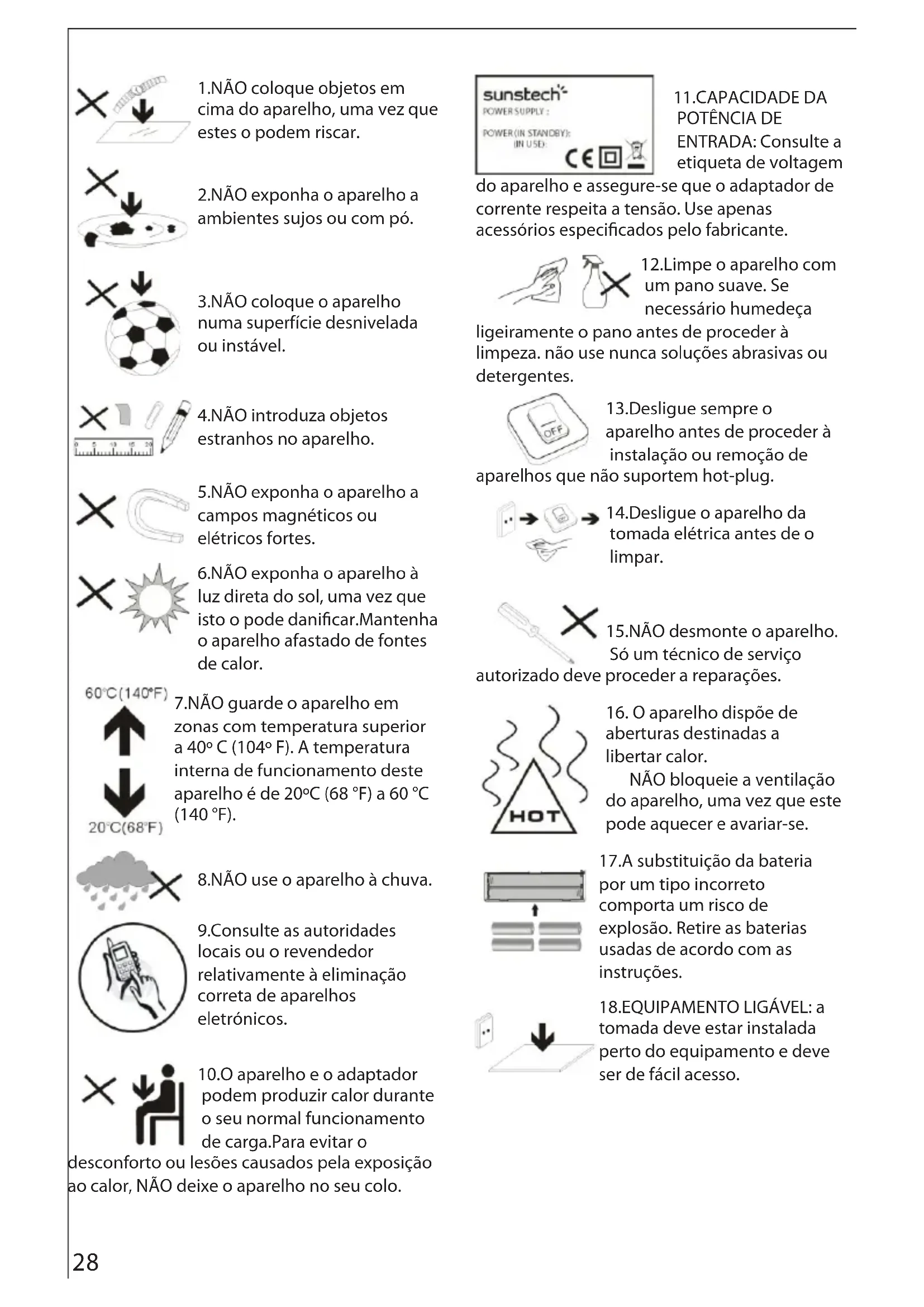 ENTRADA: Consulte a etiqueta de voltagem do aparelho e assegure-se que o adaptador de corrente respeita a tensão. Use apenas acessórios especicados pelo fabricante. 12.Limpe o aparelho com um pano suave. Se necessário humedeça ligeiramente o pano antes de proceder à limpeza. não use nunca soluções abrasivas ou detergentes. 13.Desligue sempre o aparelho antes de proceder à instalação ou remoção de aparelhos que não suportem hot-plug. 14.Desligue o aparelho da tomada elétrica antes de o limpar. 15.NÃO desmonte o aparelho. Só um técnico de serviço autorizado deve proceder a reparações.