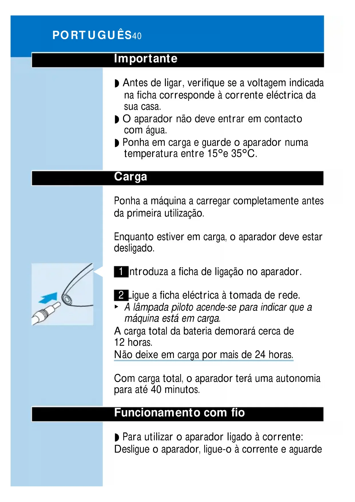 1 Puxe o pente para fora do aparador e retire-o. Limpe o aparador e ponha-o a carregar após cada utilização. Limpeza Não utilize produtos de limpeza abrasivos desengordurantes ou líquidos como álcool petróleo ou acetona na limpeza do aparador. 1 Antes de limpar, desligue o aparador e retire a ficha da corrente. 2 Retire o pente acessório.
