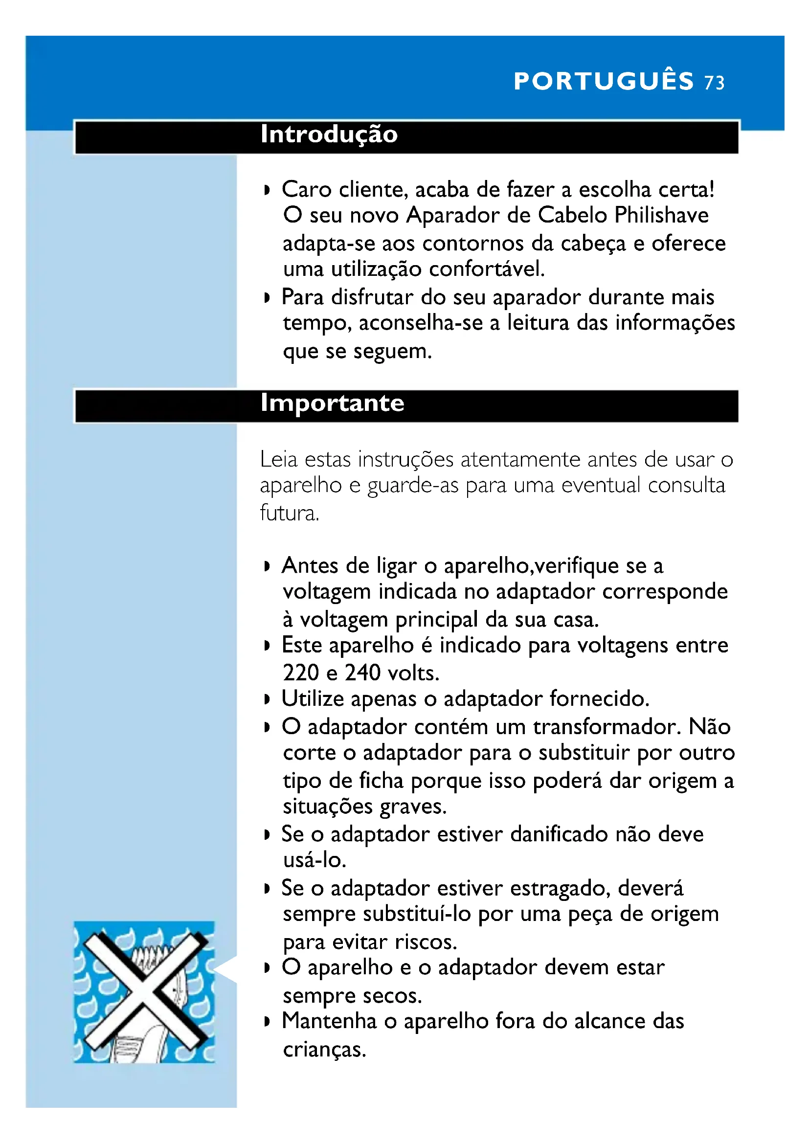 6 Estraete la batteria dall'apparecchio. Gettate la batteria e gli altri componenti conformemente alle norme in vigore in materia di smaltimento rifiuti. Non ricollegate l'apparecchio alla presa di corrente dopo aver tolto la batteria! ITALIANO 71Garanzia e Assistenza Se avete bisogno di informazioni o in caso di problemi, vi preghiamo di visitare il sito www.philips.com oppure contattate il Centro Assistenza Clienti Philips del vostro paese (per conoscere il numero, consultate l'opuscolo della garanzia). Qualora nel vostro paese non ci sia un Centro Assistenza Clienti, contattate il vostro rivenditore di fiducia oppure il Service Department of Philips Domestic Appliances and Personal Care BV. ITALIANO72Introdução ◗ Caro cliente, acaba de fazer a escolha certa! O seu novo Aparador de Cabelo Philishave adapta-se aos contornos da cabeça e oferece uma utilização confortável. ◗ Para disfrutar do seu aparador durante mais tempo, aconselha-se a leitura das informações que se seguem. Importante Leia estas instruções atentamente antes de usar o aparelho e guarde-as para uma eventual consulta futura. ◗ Antes de ligar o aparelho,verifique se a voltagem indicada no adaptador corresponde à voltagem principal da sua casa. ◗ Este aparelho é indicado para voltagens entre 220 e 240 volts. ◗ Utilize apenas o adaptador fornecido. ◗ O adaptador contém um transformador. Não corte o adaptador para o substituir por outro tipo de ficha porque isso poderá dar origem a situações graves. ◗ Se o adaptador estiver danificado não deve usá-lo. ◗ Se o adaptador estiver estragado, deverá sempre substituí-lo por uma peça de origem para evitar riscos.