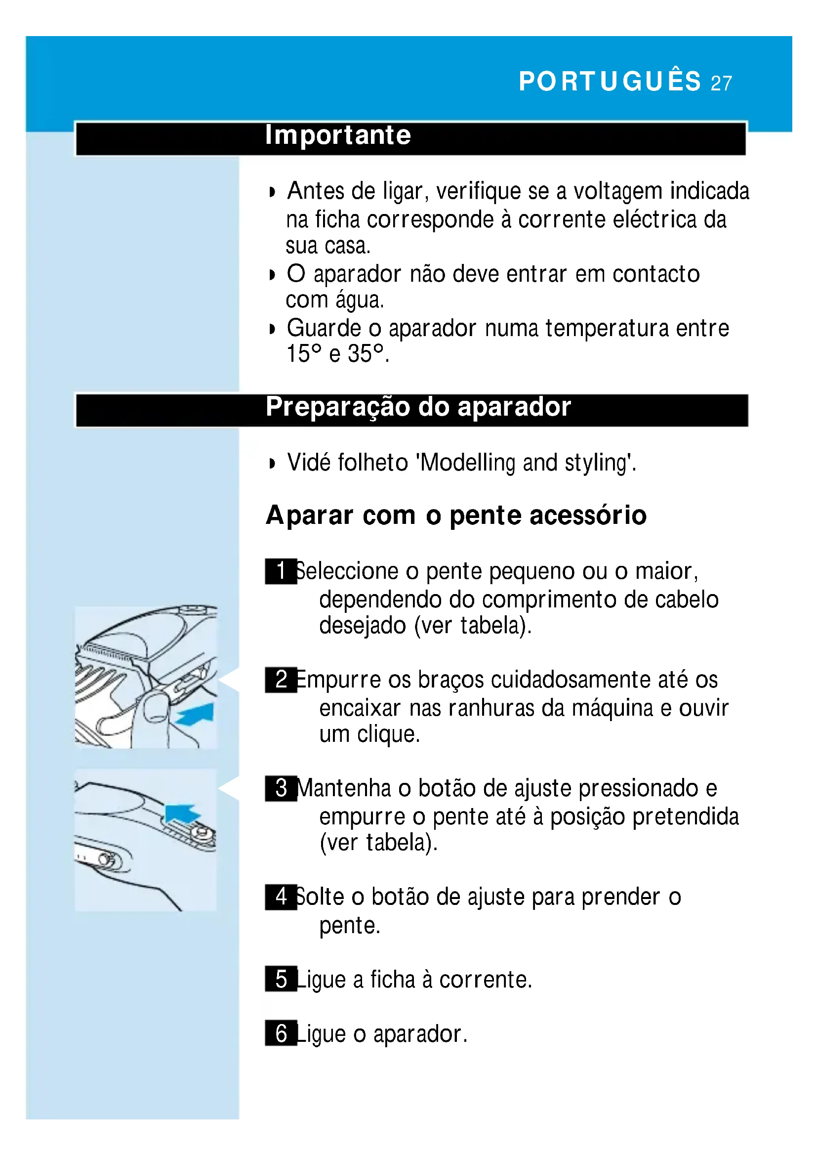 3 Mantenha o botão de ajuste pressionado e empurre o pente até à posição pretendida (ver tabela). 4 Solte o botão de ajuste para prender o pente. 5 Ligue a ficha à corrente. 6 Ligue o aparador. PORTUGUÊS 27Se houver muito cabelo acumulado no pente, retire o acessório e sopre e/ou sacuda os cabelos do pente. Posições de ajuste do comprimento Pente pequeno Pente grande Posição comp. Posição comp. do cabelo do cabelo 1 4 mm 8 24 mm 2 7 mm 9 27 mm 3 10 mm 10 30 mm 4 13 mm 11 33 mm 5 16 mm 12 35 mm 6 19 mm 13 38 mm 7 21 mm 14 40 mm Aparar sem o pente acessório