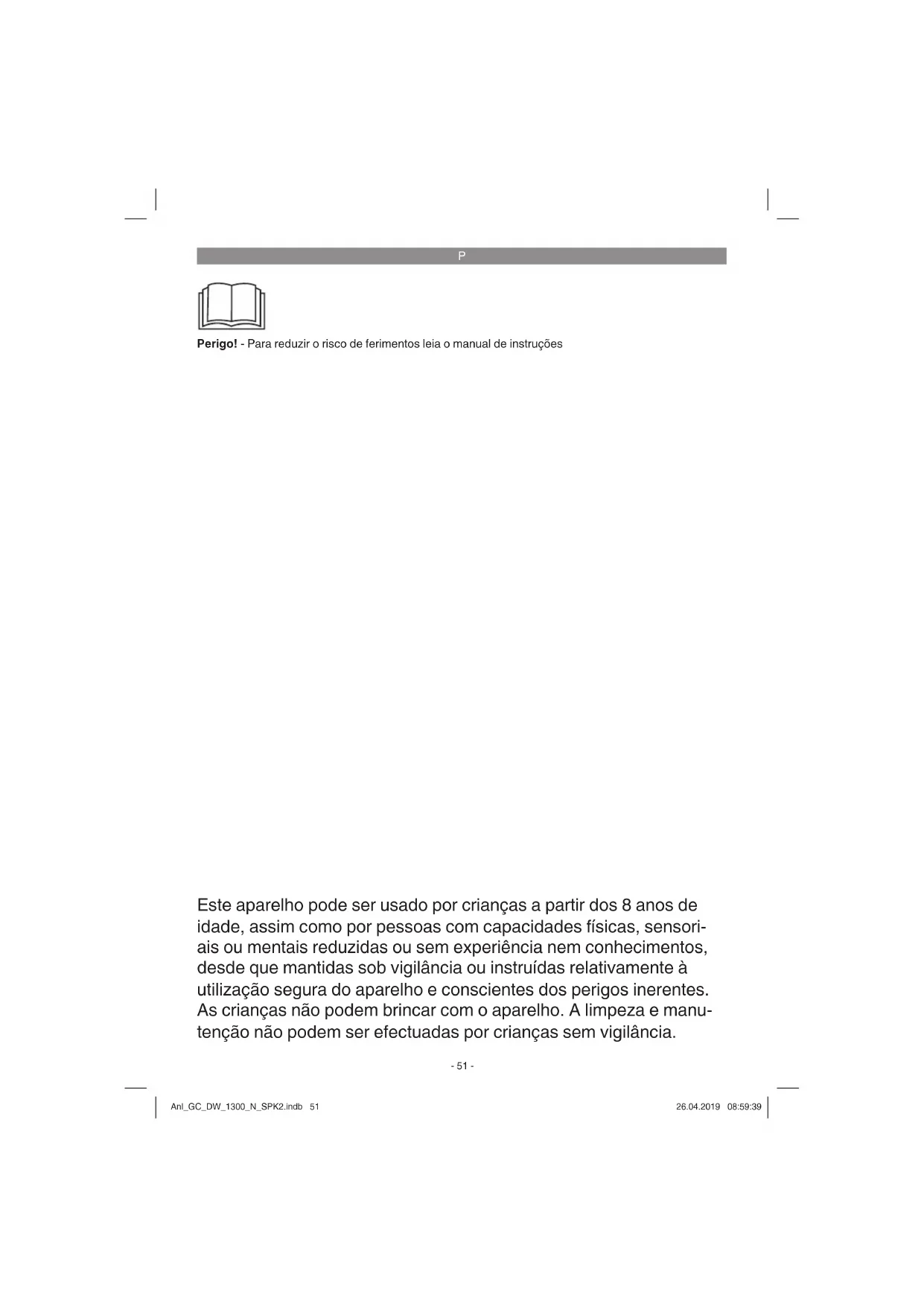 Perigo! - Para reduzir o risco de ferimentos leia o manual de instruções Este aparelho pode ser usado por crianças a partir dos 8 anos de idade, assim como por pessoas com capacidades físicas, sensori- ais ou mentais reduzidas ou sem experiência nem conhecimentos, desde que mantidas sob vigilância ou instruídas relativamente à utilização segura do aparelho e conscientes dos perigos inerentes. As crianças não podem brincar com o aparelho. A limpeza e manu- tenção não podem ser efectuadas por crianças sem vigilância. Anl_GC_DW_1300_N_SPK2.indb 51Anl_GC_DW_1300_N_SPK2.indb 51 26.04.2019 08:59:3926.04.2019 08:59:39P