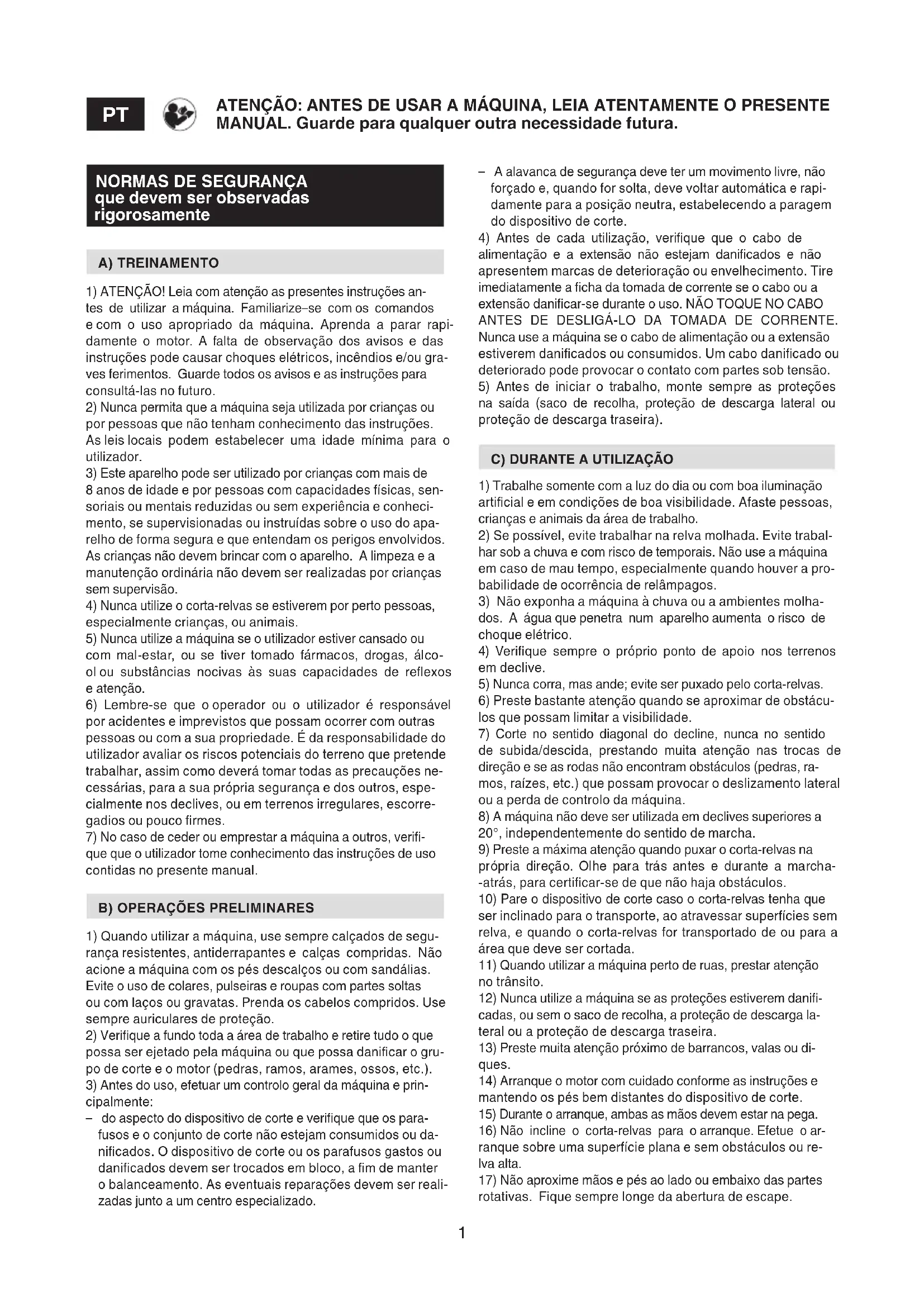 ATENÇÃO: ANTES DE USAR A MÁQUINA, LEIA ATENTAMENTE O PRESENTE MANUAL. Guarde para qualquer outra necessidade futura. – A alavanca de segurança deve ter um movimento livre, não forçado e, quando for solta, deve voltar automática e rapi- damente para a posição neutra, estabelecendo a paragem do dispositivo de corte.
