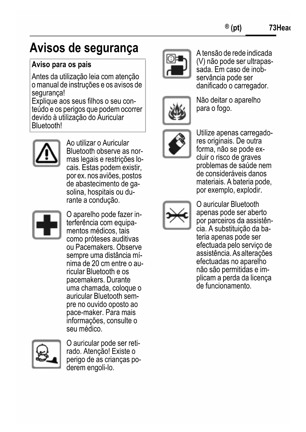 Avisos de segurança Aviso para os pais Antes da utilização leia com atenção o manual de instruções e os avisos de segurança! Explique aos seus filhos o seu con- teúdo e os perigos que podem ocorrer devido à utilização do Auricular Bluetooth! Ao utilizar o Auricular Bluetooth observe as nor- mas legais e restrições lo- cais. Estas podem existir, por ex. nos aviões, postos de abastecimento de ga- solina, hospitais ou du- rante a condução. O aparelho pode fazer in- terferência com equipa- mentos médicos, tais como próteses auditivas ou Pacemakers. Observe sempre uma distância mí- nima de 20 cm entre o au- ricular Bluetooth e os pacemakers. Durante uma chamada, coloque o auricular Bluetooth sem- pre no ouvido oposto ao pace-maker. Para mais informações, consulte o seu médico. O auricular pode ser reti- rado. Atenção! Existe o perigo de as crianças po- derem engoli-lo. A tensão de rede indicada (V) não pode ser ultrapas- sada. Em caso de inob- servância pode ser danificado o carregador. Não deitar o aparelho para o fogo. Utilize apenas carregado- res originais. De outra forma, não se pode ex- cluir o risco de graves problemas de saúde nem de consideráveis danos materiais. A bateria pode, por exemplo, explodir. O auricular Bluetooth apenas pode ser aberto por parceiros da assistên- cia. A substituição da ba- teria apenas pode ser efectuada pelo serviço de assistência. As alterações efectuadas no aparelho não são permitidas e im- plicam a perda da licença de funcionamento.Headset PTT Bluetooth