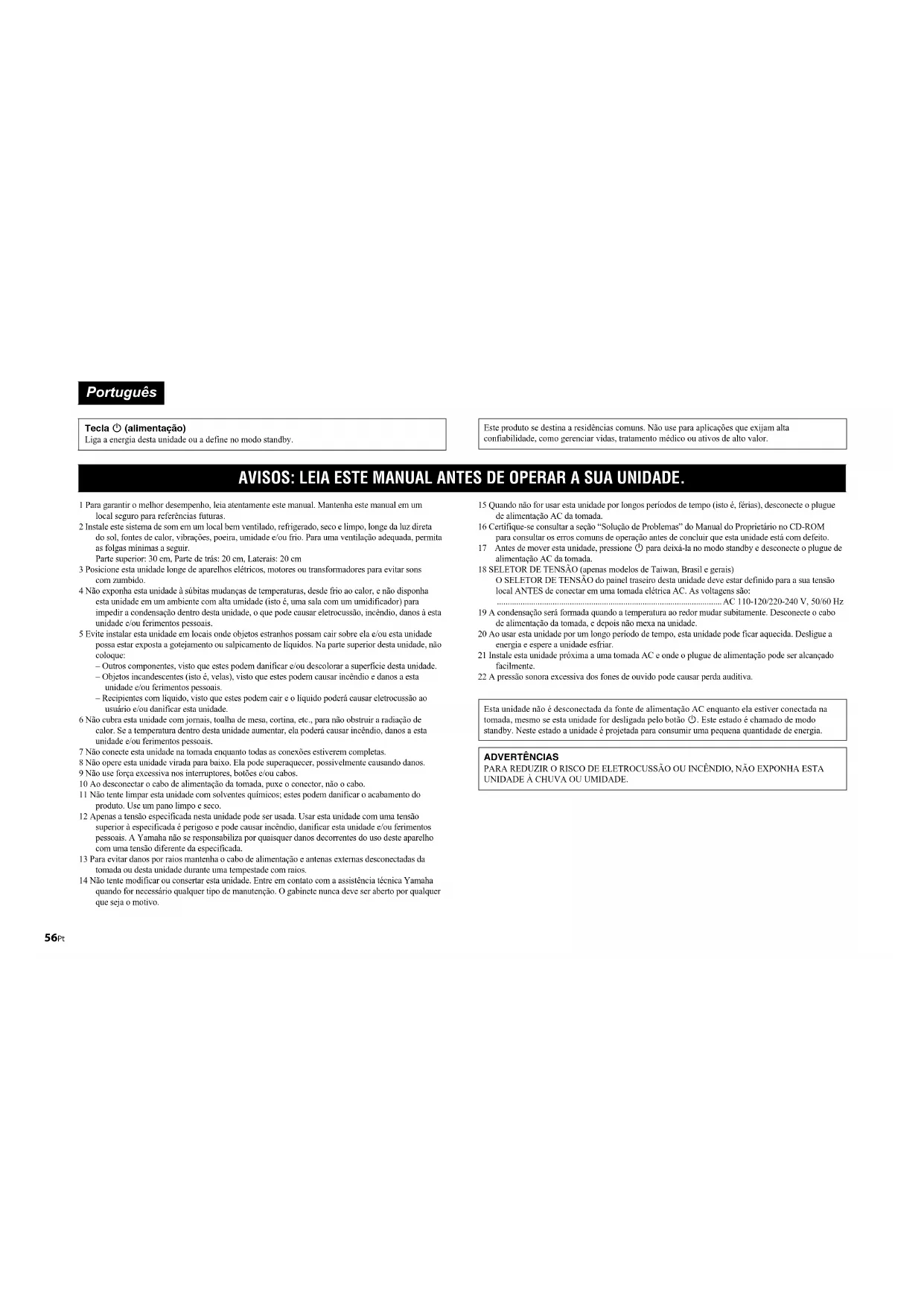 USB BLUETOOTH ENTER Teclas de cursor56 Pt 1 Para garantir o melhor desempenho, leia atentamente este manual. Mantenha este manual em um local seguro para referências futuras. 2 Instale este sistema de som em um local bem ventilado, refrigerado, seco e limpo, longe da luz direta do sol, fontes de calor, vibrações, poeira, umidade e/ou frio. Para uma ventilação adequada, permita as folgas mínimas a seguir. Parte superior: 30 cm, Parte de trás: 20 cm, Laterais: 20 cm 3 Posicione esta unidade longe de aparelhos elétricos, motores ou transformadores para evitar sons com zumbido. 4 Não exponha esta unidade à súbitas mudanças de temperaturas, desde frio ao calor, e não disponha esta unidade em um ambiente com alta umidade (isto é, uma sala com um umidificador) para impedir a condensação dentro desta unidade, o que pode causar eletrocussão, incêndio, danos à esta unidade e/ou ferimentos pessoais. 5 Evite instalar esta unidade em locais onde objetos estranhos possam cair sobre ela e/ou esta unidade possa estar exposta a gotejamento ou salpicamento de líquidos. Na parte superior desta unidade, não coloque: – Outros componentes, visto que estes podem danificar e/ou descolorar a superfície desta unidade. – Objetos incandescentes (isto é, velas), visto que estes podem causar incêndio e danos a esta unidade e/ou ferimentos pessoais. – Recipientes com líquido, visto que estes podem cair e o líquido poderá causar eletrocussão ao usuário e/ou danificar esta unidade. 6 Não cubra esta unidade com jornais, toalha de mesa, cortina, etc., para não obstruir a radiação de calor. Se a temperatura dentro desta unidade aumentar, ela poderá causar incêndio, danos a esta unidade e/ou ferimentos pessoais. 7 Não conecte esta unidade na tomada enquanto todas as conexões estiverem completas. 8 Não opere esta unidade virada para baixo. Ela pode superaquecer, possivelmente causando danos. 9 Não use força excessiva nos interruptores, botões e/ou cabos. 10 Ao desconectar o cabo de alimentação da tomada, puxe o conector, não o cabo. 11 Não tente limpar esta unidade com solventes químicos; estes podem danificar o acabamento do produto. Use um pano limpo e seco. 12 Apenas a tensão especificada nesta unidade pode ser usada. Usar esta unidade com uma tensão superior à especificada é perigoso e pode causar incêndio, danificar esta unidade e/ou ferimentos pessoais. A Yamaha não se responsabiliza por quaisquer danos decorrentes do uso deste aparelho com uma tensão diferente da especificada. 13 Para evitar danos por raios mantenha o cabo de alimentação e antenas externas desconectadas da tomada ou desta unidade durante uma tempestade com raios. 14 Não tente modificar ou consertar esta unidade. Entre em contato com a assistência técnica Yamaha quando for necessário qualquer tipo de manutenção. O gabinete nunca deve ser aberto por qualquer que seja o motivo. 15 Quando não for usar esta unidade por longos períodos de tempo (isto é, férias), desconecte o plugue de alimentação AC da tomada. 16 Certifique-se consultar a seção “Solução de Problemas” do Manual do Proprietário no CD-ROM para consultar os erros comuns de operação antes de concluir que esta unidade está com defeito. 17 Antes de mover esta unidade, pressione z para deixá-la no modo standby e desconecte o plugue de alimentação AC da tomada. 18 SELETOR DE TENSÃO (apenas modelos de Taiwan, Brasil e gerais) O SELETOR DE TENSÃO do painel traseiro desta unidade deve estar definido para a sua tensão local ANTES de conectar em uma tomada elétrica AC. As voltagens são: .........................................................................................................AC 110-120/220-240 V, 50/60 Hz 19 A condensação será formada quando a temperatura ao redor mudar subitamente. Desconecte o cabo de alimentação da tomada, e depois não mexa na unidade. 20 Ao usar esta unidade por um longo período de tempo, esta unidade pode ficar aquecida. Desligue a energia e espere a unidade esfriar. 21 Instale esta unidade próxima a uma tomada AC e onde o plugue de alimentação pode ser alcançado facilmente. 22 A pressão sonora excessiva dos fones de ouvido pode causar perda auditiva. Português Tecla z (alimentação) Liga a energia desta unidade ou a define no modo standby. Este produto se destina a residências comuns. Não use para aplicações que exijam alta confiabilidade, como gerenciar vidas, tratamento médico ou ativos de alto valor. AVISOS: LEIA ESTE MANUAL ANTES DE OPERAR A SUA UNIDADE. Esta unidade não é desconectada da fonte de alimentação AC enquanto ela estiver conectada na tomada, mesmo se esta unidade for desligada pelo botão z. Este estado é chamado de modo standby. Neste estado a unidade é projetada para consumir uma pequena quantidade de energia. ADVERTÊNCIAS PARA REDUZIR O RISCO DE ELETROCUSSÃO OU INCÊNDIO, NÃO EXPONHA ESTA UNIDADE À CHUVA OU UMIDADE.Pt 57 ■ Notas sobre os controles remotos e pilhas