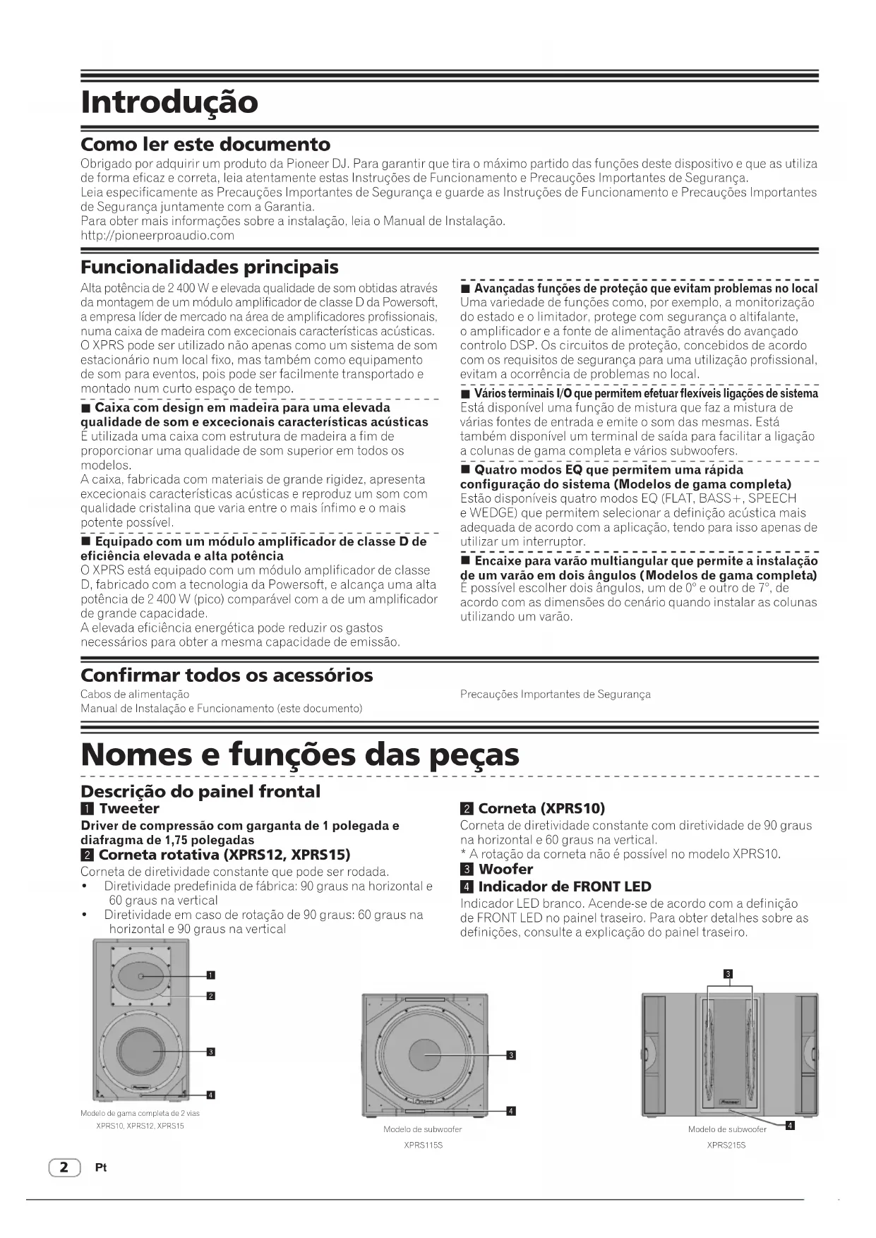 Introdução Como ler este documento Obrigado por adquirir um produto da Pioneer DJ. Para garantir que tira o máximo partido das funções deste dispositivo e que as utiliza de forma eficaz e correta, leia atentamente estas Instruções de Funcionamento e Precauções Importantes de Segurança. Leia especificamente as Precauções Importantes de Segurança e guarde as Instruções de Funcionamento e Precauções Importantes de Segurança juntamente com a Garantia. Para obter mais informações sobre a instalação, leia o Manual de Instalação. http://pioneerproaudio.com Alta potência de 2 400 W e elevada qualidade de som obtidas através da montagem de um módulo amplificador de classe D da Powersoft, a empresa líder de mercado na área de amplificadores profissionais, numa caixa de madeira com excecionais características acústicas. O XPRS pode ser utilizado não apenas como um sistema de som estacionário num local fixo, mas também como equipamento de som para eventos, pois pode ser facilmente transportado e montado num curto espaço de tempo.