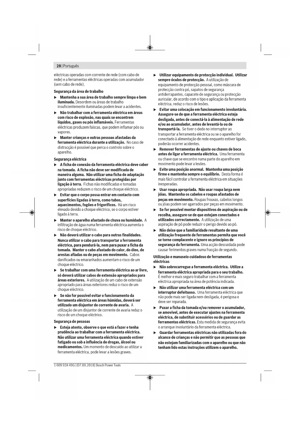 de la longitud del tornillo. Mantenimiento y servicio Mantenimiento y limpieza u Desmonte el acumulador antes de manipular la herra- mienta eléctrica (p. ej. en el mantenimiento, cambio de útil, etc.) así como al transportarla y guardarla. En caso contrario podría accidentarse al accionar fortuita- mente el interruptor de conexión/desconexión. u Mantenga limpia la herramienta eléctrica y las rejillas de refrigeración para trabajar con eficacia y seguri- dad. Si a pesar de los esmerados procesos de fabricación y con- trol, la herramienta eléctrica llegase a averiarse, la repara- ción deberá encargarse a un servicio técnico autorizado para herramientas eléctricas Bosch. Servicio técnico y atención al cliente El servicio técnico le asesorará en las consultas que Ud. pue- da tener sobre la reparación y mantenimiento de su produc- to, así como sobre piezas de recambio. Las representacio- nes gráficas tridimensionales e informaciones de repuestos se encuentran también bajo: www.bosch-pt.com El equipo asesor de aplicaciones de Bosch le ayuda gustosa- mente en caso de preguntas sobre nuestros productos y sus accesorios. Para cualquier consulta o pedido de piezas de repuesto es imprescindible indicar el nº de artículo de 10dígitos que fi- gura en la placa de características del producto. España Robert Bosch España S.L.U. Departamento de ventas Herramientas Eléctricas C/Hermanos García Noblejas, 19 28037 Madrid Para efectuar su pedido online de recambios o pedir la reco-gida para la reparación de su máquina, entre en la página www.herramientasbosch.net. Tel. Asesoramiento al cliente: 902 531 553 Fax: 902 531554 Argentina Robert Bosch Argentina S.A. Calle Blanco Encalada 250 – San Isidro Código Postal B1642AMQ Ciudad Autónoma de Buenos Aires Tel.: (54) 11 5296 5200 E-Mail: herramientas.bosch@ar.bosch.com www.argentina.bosch.com.ar Chile Robert Bosch S.A. Calle El Cacique 0258 Providencia – Santiago de Chile Buzón Postal 7750000 Tel.: (56) 02 782 0200 www.bosch.cl Ecuador Robert Bosch Sociedad Anónima Av. Rodrigo Chávez Gonzalez Parque Empresarial Colón Edif. Coloncorp Piso 1 Local 101-102, Guayaquil Tel.: (593) 4 220 4000 E-mail: ventas@bosch.com.ec www.bosch.ec México Robert Bosch S. de R.L. de C.V. Calle Robert Bosch No. 405 C.P. 50071 Zona Industrial, Toluca - Estado de México Tel.: (52) 55 528430-62 Tel.: 800 6271286 www.bosch-herramientas.com.mx Perú Robert Bosch S.A.C. Av. Primavera 781 Piso 2, Urbanización Chacarilla San Borja Lima Tel.: (51) 1 706 1100 www.bosch.com.pe Venezuela Robert Bosch S.A. Calle Vargas con Buen Pastor, Edif. Alba, P-1, Boleita Norte, Caracas 1071 Tel.: (58) 212 207-4511 www.boschherramientas.com.ve Transporte Los acumuladores de iones de litio incorporados están suje- tos a los requerimientos estipulados en la legislación sobre mercancías peligrosas. Los acumuladores pueden ser trans- portados por carretera por el usuario sin más imposiciones. En el envío por terceros (p.ej., transporte aéreo o por agen- cia de transportes) deberán considerarse las exigencias es- peciales en cuanto a su embalaje e identificación. En este ca- so deberá recurrirse a los servicios de un experto en mercan- cías peligrosas al preparar la pieza para su envío. Únicamente envíe acumuladores si su carcasa no está daña- da. Si los contactos no van protegidos cúbralos con cinta adhesiva y embale el acumulador de manera que éste no se pueda mover dentro del embalaje. Observe también las prescripciones adicionales que pudieran existir al respecto en su país. Eliminación Las herramientas eléctricas, acumuladores, accesorios y embalajes deberán someterse a un proceso de recuperación que respete el me- dio ambiente. ¡No arroje las herramientas eléctricas, acumu- ladores o pilas a la basura! Sólo para los países de laUE: Las herramientas eléctricas inservibles, así como los acumu- ladores/pilas defectuosos o agotados deberán coleccionarse por separado para ser sometidos a un reciclaje ecológico se- gún las Directivas Europeas 2012/19/UE y 2006/66/CE, respectivamente. Acumuladores/pilas: Iones de Litio: Por favor, observe las indicaciones en el apartado Transpor- te (ver "Transporte", Página27). El símbolo es solamente válido, si también se encuentra sobre la placa de características del producto/fabricado. Português Instruções de segurança Instruções gerais de segurança para ferramentas eléctricas AVISO Devem ser lidas todas as indicações de segurança, instruções, ilustrações e especificações desta ferramenta eléctrica. O desrespeito das instruções apresentadas abaixo poderá resultar em choque eléctrico, incêndio e/ou ferimentos graves. Guarde bem todas as advertências e instruções para futura referência. O termo "ferramenta eléctrica" utilizado a seguir nas indicações de advertência, refere‑se a ferramentas Português | 27 Bosch Power Tools 1 609 92A 49G | (07.09.2018)28 | Português 1 609 92A 49G | (07.09.2018) Bosch Power Tools eléctricas operadas com corrente de rede (com cabo de rede) e a ferramentas eléctricas operadas com acumulador (sem cabo de rede). Segurança da área de trabalho u Mantenha a sua área de trabalho sempre limpa e bem iluminada. Desordem ou áreas de trabalho insuficientemente iluminadas podem levar a acidentes. u Não trabalhar com a ferramenta eléctrica em áreas com risco de explosão, nas quais se encontrem líquidos, gases ou pós inflamáveis. Ferramentas eléctricas produzem faíscas, que podem inflamar pós ou vapores. u Manter crianças e outras pessoas afastadas da ferramenta eléctrica durante a utilização. No caso de distracção é possível que perca o controlo sobre o aparelho. Segurança eléctrica u A ficha de conexão da ferramenta eléctrica deve caber na tomada. A ficha não deve ser modificada de maneira alguma. Não utilizar uma ficha de adaptação junto com ferramentas eléctricas protegidas por ligação à terra. Fichas não modi