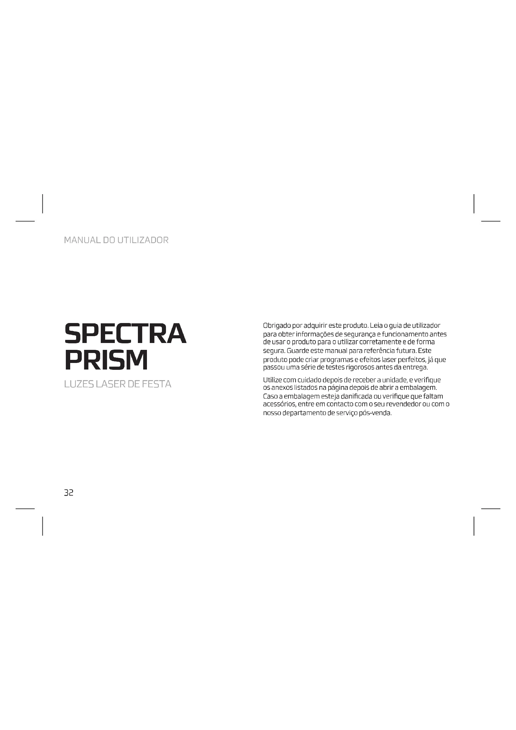 Obrigado por adquirir este produto. Leia o guia de utilizador para obter informações de segurança e funcionamento antes de usar o produto para o utilizar corretamente e de forma segura. Guarde este manual para referência futura. Este produto pode criar programas e efeitos laser perfeitos, já que passou uma série de testes rigorosos antes da entrega. Utilize com cuidado depois de receber a unidade, e verifique os anexos listados na página depois de abrir a embalagem. Caso a embalagem esteja danificada ou verifique que faltam acessórios, entre em contacto com o seu revendedor ou com o nosso departamento de serviço pós-venda. SPECTRA PRISM