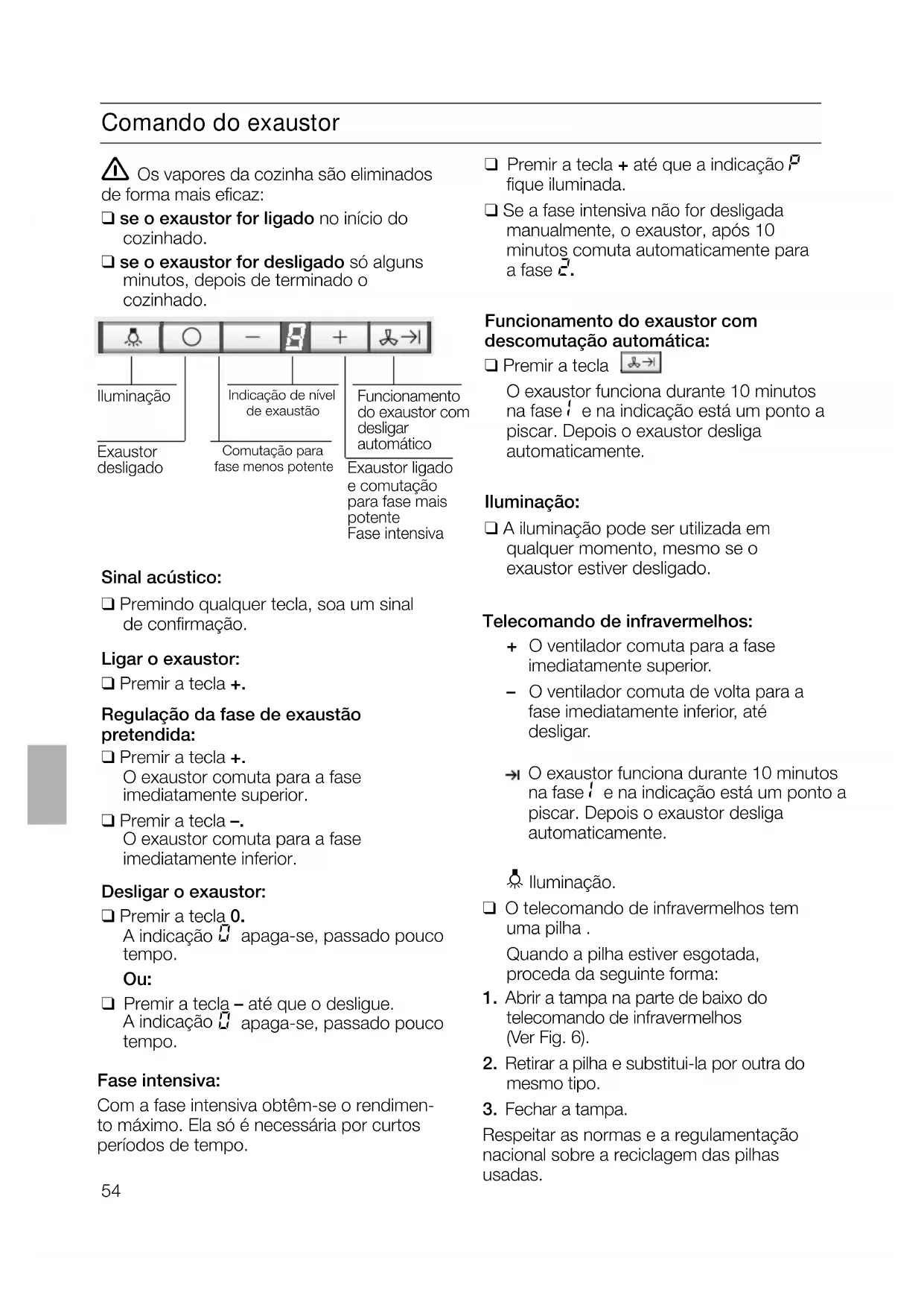 Funcionamento do exaustor com descomutação automática: ❑ Premir a tecla . O exaustor funciona durante 10 minutos na fase | e na indicação está um ponto a piscar. Depois o exaustor desliga automaticamente. Iluminação: ❑ A iluminação pode ser utilizada em qualquer momento, mesmo se o exaustor estiver desligado. Telecomando de infravermelhos: + O ventilador comuta para a fase imediatamente superior. – O ventilador comuta de volta para a fase imediatamente inferior, até desligar. 0 Iluminação. ❑ O telecomando de infravermelhos tem umapilha. Quando a pilha estiver esgotada, proceda da seguinte forma: