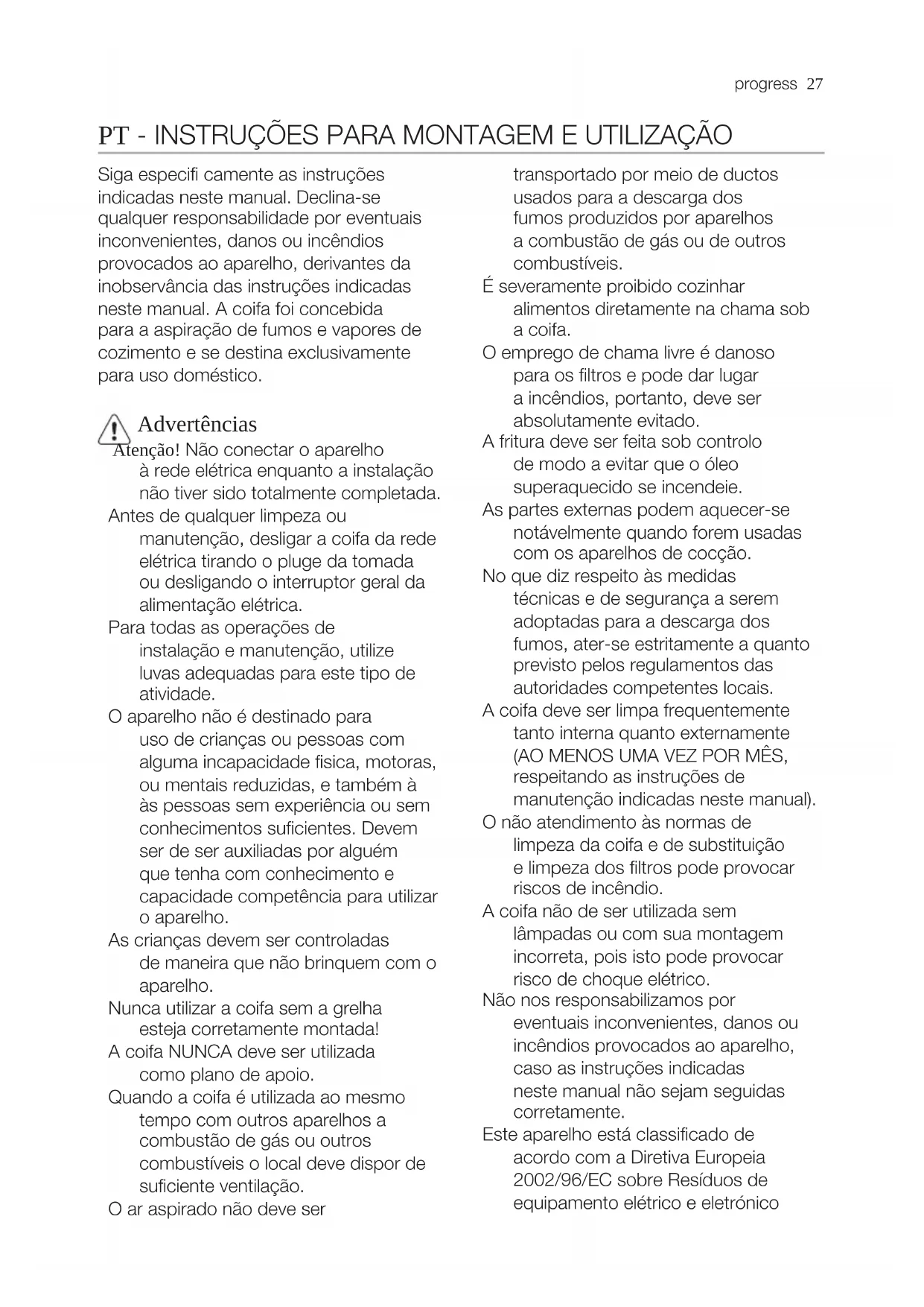 (3), media (4), máxima (5). Usar la potencia de aspiraciòn mayor en caso de particular concentraciòn de vapores de cocina. Aconcejamos de encender la aspiraciòn 5 minutos antes de iniciar a cocinar y dejarla en funciòn por otros 15 minutos aproximadamente. Mantenimiento ¡Atención! Antes de cualquier operación de limpieza o mantenimiento, retire la campana de la red eléctrica desconectando el enchufe o desconectando el interruptor general de la casa. La campana debe ser limpiada con frecuencia tanto externamente como internamente (con la misma frecuencia con la que se realiza el mantenimiento de los fi ltros de grasa). Para la limpieza, utilice un paño impregnado de detergente líquido neutro. No utilice productos que contengan abrasivos. ¡NO UTILICE ALCOHOL! ATENCION: De no observarse las instrucciones dadas para limpiar el aparato y sustituir el filtro, puede producirse un incendio. El fabricante recomienda leerlas y respetarlas atentamente.26 progress El fabricante no se hace responsable por los daños al motor o los incendios provocados en el aparato debido a intervenciones de mantenimiento incorrectas o al incumplimiento de las normas de seguridad proporcionadas. Filtro antigrasa Fig. 1-17 El fi ltro antigrasa debe limpiarse una vez al mes con detergentes no agresivos, manualmente o bien en lavavajillas a bajas temperaturas y con ciclo breve. Con el lavado en el lavavajilla el fi ltro antigrasa metálico puede desteñirse pero sus características de fi ltrado no cambian absolutamente. Filtro al carbón activo (solamente para la versión fi ltrante) Fig. 16 Type 20 LONG LIFE - Filtro al carbón activo lavable El fi ltro al carbón puede lavarse cada dos meses con agua caliente y detergentes adecuados o en lavavajillas a 65°C ( en caso de lavado con lavavajillas, realice el ciclo de lavado completo sin platos en el interior.). Quite el agua que haya quedado en el fi ltro sin estropearlo, después quite el almohadillado situado en el interior del armazón de plástico y póngalo en el horno a 100°C durante diez minutos para secarlo completamente. Cambie el almohadillado cada 3 años y cada vez que el paño se estropee. Type 15 - Filtro al carbón activo NO lavable La saturaciòn del carbòn activado ocurre despuès da mas o menos tiempo de uso prolongado, dependiendo del tipo de cocina y de la regularidad de limpieza del fi ltro de grasa. En cualquier caso es necesario sustituir el cartucho al menos cada 4 meses. NO puede lavarse o reciclarse. Sustitución de la lámpara Fig. 18 Desconecte el aparato de la red elèctrica. Atención! Antes de tocar las lámparas asegúrese de que esten frías. Utilizar sólo lámparas halógenas de 12V -20W max - G4 (Adecuada para su uso en luminaria abierta) prestando atención en no tocarlas con las manos.progress 27 PT - INSTRUÇÕES PARA MONTAGEM E UTILIZAÇÃO Siga especifi camente as instruções indicadas neste manual. Declina-se qualquer responsabilidade por eventuais inconvenientes, danos ou incêndios provocados ao aparelho, derivantes da inobservância das instruções indicadas neste manual. A coifa foi concebida para a aspiração de fumos e vapores de cozimento e se destina exclusivamente para uso doméstico. Advertências Atenção! Não conectar o aparelho à rede elétrica enquanto a instalação não tiver sido totalmente completada. Antes de qualquer limpeza ou manutenção, desligar a coifa da rede elétrica tirando o pluge da tomada ou desligando o interruptor geral da alimentação elétrica. Para todas as operações de instalação e manutenção, utilize luvas adequadas para este tipo de atividade. O aparelho não é destinado para uso de crianças ou pessoas com alguma incapacidade fisica, motoras, ou mentais reduzidas, e também à às pessoas sem experiência ou sem conhecimentos suficientes. Devem ser de ser auxiliadas por alguém que tenha com conhecimento e capacidade competência para utilizar o aparelho. As crianças devem ser controladas de maneira que não brinquem com o aparelho. Nunca utilizar a coifa sem a grelha esteja corretamente montada! A coifa NUNCA deve ser utilizada como plano de apoio. Quando a coifa é utilizada ao mesmo tempo com outros aparelhos a combustão de gás ou outros combustíveis o local deve dispor de suficiente ventilação. O ar aspirado não deve ser transportado por meio de ductos usados para a descarga dos fumos produzidos por aparelhos a combustão de gás ou de outros combustíveis. É severamente proibido cozinhar alimentos diretamente na chama sob a coifa. O emprego de chama livre é danoso para os filtros e pode dar lugar a incêndios, portanto, deve ser absolutamente evitado. A fritura deve ser feita sob controlo de modo a evitar que o óleo superaquecido se incendeie. As partes externas podem aquecer-se notávelmente quando forem usadas com os aparelhos de cocção. No que diz respeito às medidas técnicas e de segurança a serem adoptadas para a descarga dos fumos, ater-se estritamente a quanto previsto pelos regulamentos das autoridades competentes locais. A coifa deve ser limpa frequentemente tanto interna quanto externamente (AO MENOS UMA VEZ POR MÊS, respeitando as instruções de manutenção indicadas neste manual). O não atendimento às normas de limpeza da coifa e de substituição e limpeza dos filtros pode provocar riscos de incêndio. A coifa não de ser utilizada sem lâmpadas ou com sua montagem incorreta, pois isto pode provocar risco de choque elétrico. Não nos responsabilizamos por eventuais inconvenientes, danos ou incêndios provocados ao aparelho, caso as instruções indicadas neste manual não sejam seguidas corretamente. Este aparelho está classificado de acordo com a Diretiva Europeia 2002/96/EC sobre Resíduos de equipamento elétrico e eletrónico28 progress (REEE). Ao garantir a eliminação adequada deste produto, estará a ajudar a evitar potenciais consequências negativas para o ambiente e para a saúde pública, que poderiam deriva