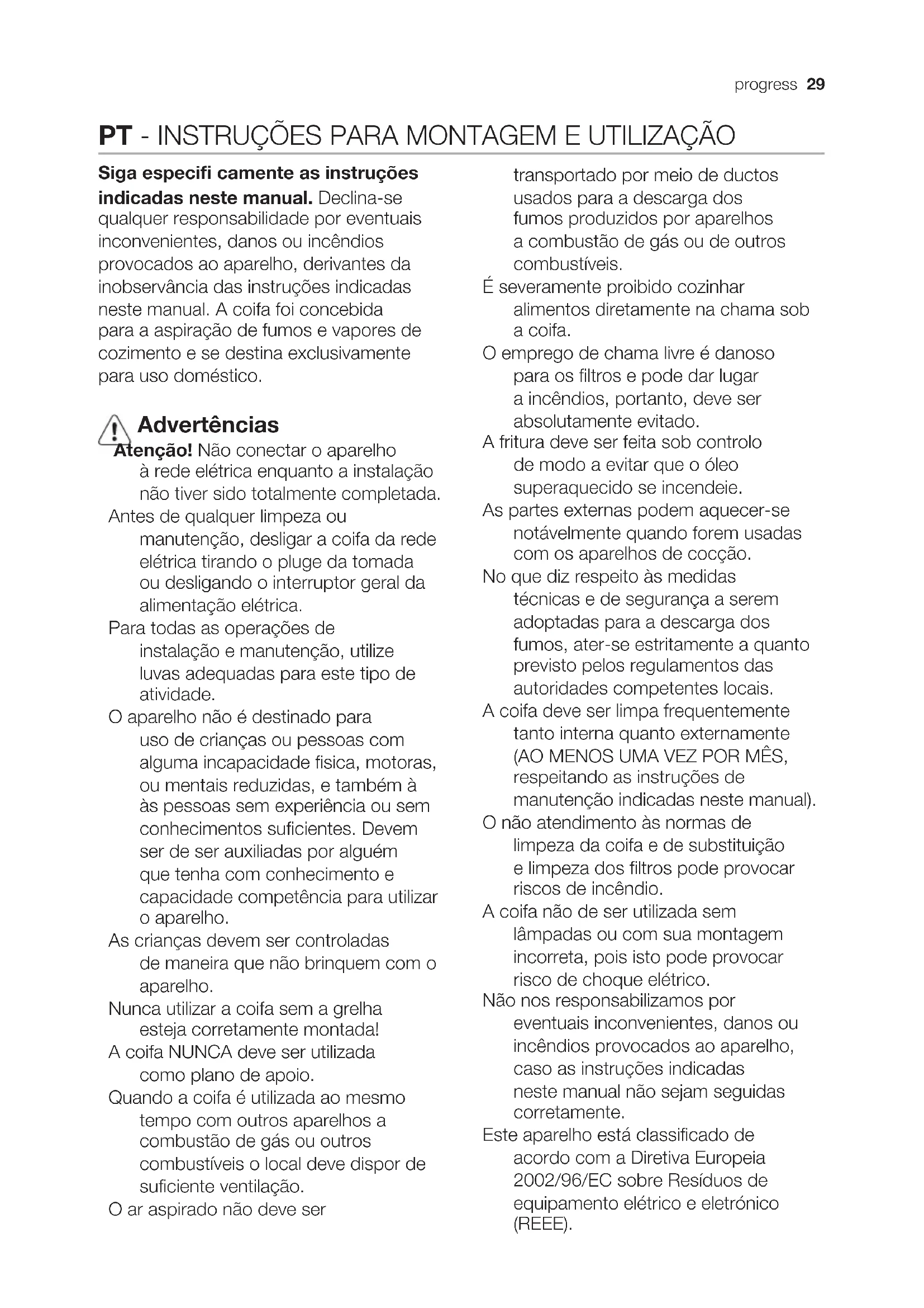 (3.),máxima (4.).28 progress Mantenimiento ¡Atención! Antes de cualquier operación de limpieza o mantenimiento, retire la campana de la red eléctrica desconectando el enchufe o desconectando el interruptor general de la casa. La campana debe ser limpiada con frecuencia tanto externamente como internamente (con la misma frecuencia con la que se realiza el mantenimiento de los fi ltros de grasa). Para la limpieza, utilice un paño impregnado de detergente líquido neutro. No utilice productos que contengan abrasivos. ¡NO UTILICE ALCOHOL! ATENCION: De no observarse las instrucciones dadas para limpiar el aparato y sustituir el filtro, puede producirse un incendio. El fabricante recomienda leerlas y respetarlas atentamente. El fabricante no se hace responsable por los daños al motor o los incendios provocados en el aparato debido a intervenciones de mantenimiento incorrectas o al incumplimiento de las normas de seguridad proporcionadas. Filtro antigrasa Fig. 1-16 Debe limpiarse una vez al mes (o cuando el sistema de indicación de saturación de los fi ltros - si está previsto en el modelo que se posee - indica esta necesidad) con detergentes no agresivos, manualmente o bien en lavavajillas a bajas temperaturas y con ciclo breve. Con el lavado en el lavavajilla el fi ltro antigrasa metálico puede desteñirse pero sus características de fi ltrado no cambian absolutamente. Filtro al carbón activo (solamente para la versión filtrante) Fig. 15 Type 20 LONG LIFE - Filtro al carbón activo lavable El fi ltro al carbón puede lavarse cada dos meses con agua caliente y detergentes adecuados o en lavavajillas a 65°C ( en caso de lavado con lavavajillas, realice el ciclo de lavado completo sin platos en el interior.). Quite el agua que haya quedado en el fi ltro sin estropearlo, después quite el almohadillado situado en el interior del armazón de plástico y póngalo en el horno a 100°C durante diez minutos para secarlo completamente. Cambie el almohadillado cada 3 años y cada vez que el paño se estropee. Type 15 - Filtro al carbón activo NO lavable La saturaciòn del carbòn activado ocurre despuès da mas o menos tiempo de uso prolongado, dependiendo del tipo de cocina y de la regularidad de limpieza del fi ltro de grasa. En cualquier caso es necesario sustituir el cartucho al menos cada 4 meses. NO puede lavarse o reciclarse. Sustitución de la lámpara Desconecte el aparato de la red elèctrica. Atención! Antes de tocar las lámparas asegúrese de que esten frías. Utilizar sólo lámparas halógenas con forma a vela Ø35mm E14 28W.progress 29 PT - INSTRUÇÕES PARA MONTAGEM E UTILIZAÇÃO Siga especifi camente as instruções indicadas neste manual. Declina-se qualquer responsabilidade por eventuais inconvenientes, danos ou incêndios provocados ao aparelho, derivantes da inobservância das instruções indicadas neste manual. A coifa foi concebida para a aspiração de fumos e vapores de cozimento e se destina exclusivamente para uso doméstico. Advertências Atenção! Não conectar o aparelho à rede elétrica enquanto a instalação não tiver sido totalmente completada. Antes de qualquer limpeza ou manutenção, desligar a coifa da rede elétrica tirando o pluge da tomada ou desligando o interruptor geral da alimentação elétrica. Para todas as operações de instalação e manutenção, utilize luvas adequadas para este tipo de atividade. O aparelho não é destinado para uso de crianças ou pessoas com alguma incapacidade fisica, motoras, ou mentais reduzidas, e também à às pessoas sem experiência ou sem conhecimentos suficientes. Devem ser de ser auxiliadas por alguém que tenha com conhecimento e capacidade competência para utilizar o aparelho. As crianças devem ser controladas de maneira que não brinquem com o aparelho. Nunca utilizar a coifa sem a grelha esteja corretamente montada! A coifa NUNCA deve ser utilizada como plano de apoio. Quando a coifa é utilizada ao mesmo tempo com outros aparelhos a combustão de gás ou outros combustíveis o local deve dispor de suficiente ventilação. O ar aspirado não deve ser transportado por meio de ductos usados para a descarga dos fumos produzidos por aparelhos a combustão de gás ou de outros combustíveis. É severamente proibido cozinhar alimentos diretamente na chama sob a coifa. O emprego de chama livre é danoso para os filtros e pode dar lugar a incêndios, portanto, deve ser absolutamente evitado. A fritura deve ser feita sob controlo de modo a evitar que o óleo superaquecido se incendeie. As partes externas podem aquecer-se notávelmente quando forem usadas com os aparelhos de cocção. No que diz respeito às medidas técnicas e de segurança a serem adoptadas para a descarga dos fumos, ater-se estritamente a quanto previsto pelos regulamentos das autoridades competentes locais. A coifa deve ser limpa frequentemente tanto interna quanto externamente (AO MENOS UMA VEZ POR MÊS, respeitando as instruções de manutenção indicadas neste manual). O não atendimento às normas de limpeza da coifa e de substituição e limpeza dos filtros pode provocar riscos de incêndio. A coifa não de ser utilizada sem lâmpadas ou com sua montagem incorreta, pois isto pode provocar risco de choque elétrico. Não nos responsabilizamos por eventuais inconvenientes, danos ou incêndios provocados ao aparelho, caso as instruções indicadas neste manual não sejam seguidas corretamente. Este aparelho está classificado de acordo com a Diretiva Europeia 2002/96/EC sobre Resíduos de equipamento elétrico e eletrónico (REEE).30 progress Ao garantir a eliminação adequada deste produto, estará a ajudar a evitar potenciais consequências negativas para o ambiente e para a saúde pública, que poderiam derivar de um manuseamento de desperdícios inadequado deste produto. O símbolo no produto, ou nos documentos que acompanham o produto, indica que este aparelho não pode receber um tratamento semelhante ao de um desperdí
