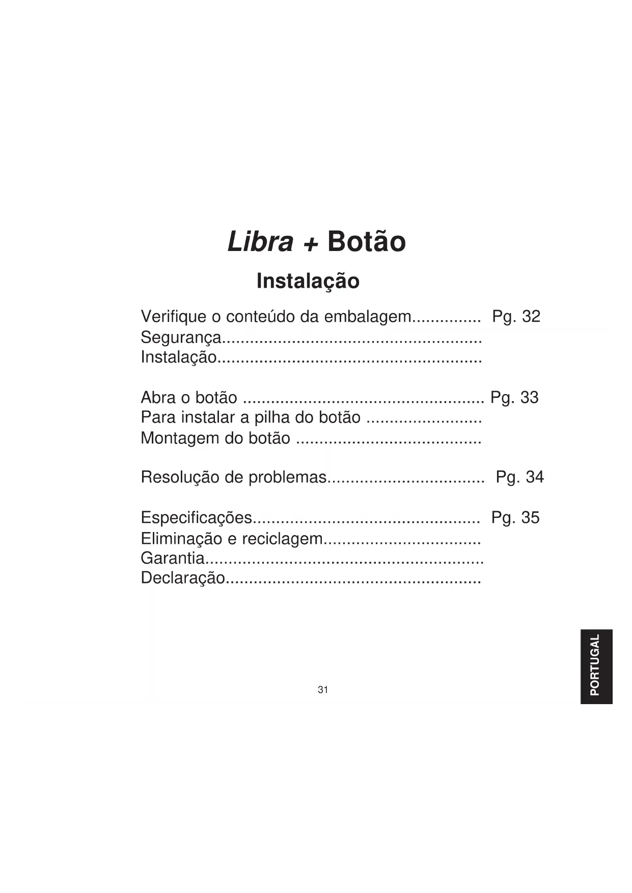 Proceda à montagem utilizando os parafusos fornecidos, (consulte a Fig. 3). Teste o botão antes de o fixar. Evite a fixação em estruturas metálicas. Montagem do botão Fig. 334 Escuta-se um “bip” no modo learn (memorizar)… ● A campainha já memorizou o botão que está a programar. ● Caso pretenda alterar o ícone associado ao botão, utilize o procedimento un-learn (desmemorizar) e depois programe novamente o botão. Escutam-se dois “bips” depois da campainha normal tocar… ● Indica que a pilha está fraca no botão que activou a campainha. Instale uma pilha nova, tipo CR2032. Quando premir o botão da campainha, a led indicador de funcionamento permanece acesa durante um curto período de tempo… ● Em condições normais, esse led âmbar acende durante 1 segundo. Quando a pilha estiver a luz apenas acenderá durante um curto período de tempo. Instale uma pilha nova, tipo CR2032. A campainha não funciona… ● Verifique se as pilhas são do tipo correcto. Utilize apenas pilhas alcalinas ● Verifique se as pilhas estão correctamente instaladas. ● A campainha pode encontrar-se fora do alcance do botão. Experimente a campainha num local diferente. ● A campainha pode não estar a identificar o botão. Cumpra o procedimento de programação. A campainha não toca… ● Verifique se o controlo de volume não está no mínimo. O alcance é reduzido… ● Estruturas metálicas, incluindo portas em PVC podem reduzir o alcance do equipamento. Evite montar o botão ou a campainha próximo ou em estruturas metálicas. ● Existem outros equipamentos que podem provocar interferências rádio que podem afectar a campainha. ● Paredes e tectos reduzem o alcance. ● Pilhas fracas reduzem o alcance. Substitua ao fim de 12–18 meses. Em condições de temperaturas reduzidas (abaixo dos 5ºC), poderá ser necessário substituir as pilhas com maior frequência. O botão não funcionam com o meu equipamento Libra mais antigo… ● Libra + não é compatível com o sistema Libra mais antigo. ● Utilize apenas acessórios com a indicação Libra + Resolução de problemas35 Especificações Especificações Temperatura de funcionamento Frequência RF – RU/Europa Potência RF Tipo de pilhas Vida útil das pilhas (5 activações/dia) Classificação IP A Friedland garante este produto durante 2 anos desde a data de aquisição. É necessária a prova de compra; esta garantia não afecta os seus direitos estatutários. Garantia As pilhas e os produtos eléctricos usados não devem ser eliminados junto com o lixo doméstico. Proceda à reciclagem sempre que existirem instalações para o efeito. Para obter mais informações sobre reciclagem, consulte a autoridade local ou o fornecedor. Disposções A Novar ED&S declara que Botão sem-fios está em conformidade com os requisitos essenciais e outras disposições relevantes da directiva Equipamentos de Rádio e Equipamentos Terminais de Telecomunicações (R&TTE), 1999/5/EC. Declaração Botão -10 a 40ºC 868 MHz <10mW CR2032 18 meses IP55 Friedland, The Arnold Centre, Paycocke Road, Basildon, Essex, SS14 3EA www.friedland.co.uk