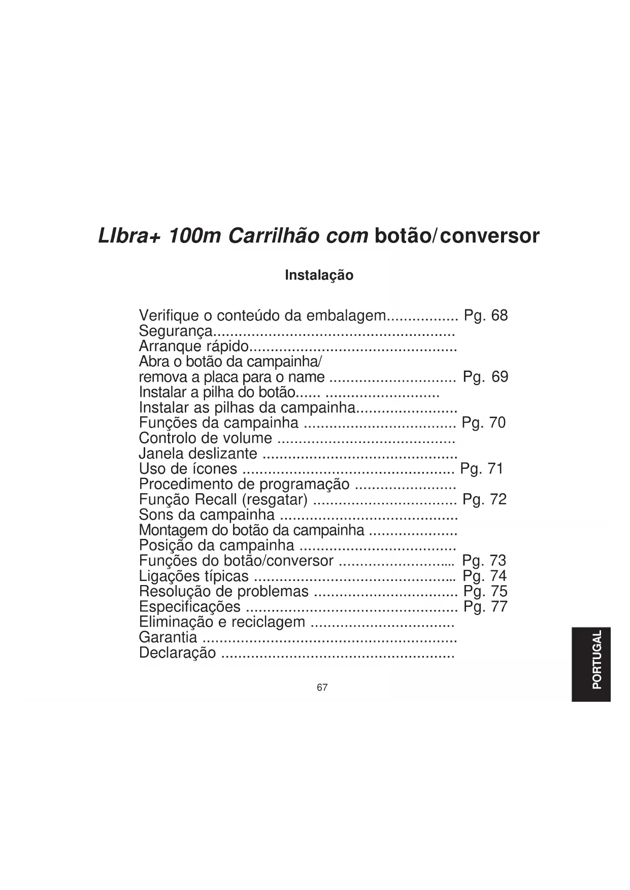 LR6 12 mesi IP3x67 LIbra+ 100m Carrilhão com botão/conversor Instalação Verifique o conteúdo da embalagem................. Pg. 68 Segurança......................................................... Arranque rápido................................................. Abra o botão da campainha/ remova a placa para o name .............................. Pg. 69 Instalar a pilha do botão...... ........................... Instalar as pilhas da campainha........................ Funções da campainha .................................... Pg. 70 Controlo de volume .......................................... Janela deslizante .............................................. Uso de ícones .................................................. Pg. 71 Procedimento de programação ........................ Função Recall (resgatar) .................................. Pg. 72 Sons da campainha .......................................... Montagem do botão da campainha ..................... Posição da campainha ..................................... Funções do botão/conversor ............................ Pg. 73 Ligações típicas ................................................ Pg. 74 Resolução de problemas .................................. Pg. 75 Especificações .................................................. Pg. 77 Eliminação e reciclagem .................................. Garantia ............................................................ Declaração ....................................................... PORTUGAL68 LIbra+ 100m Campainha com botão/conversor Obrigado por ter escolhido este produto Friedland. De modo a garantir a instalação e a utilização correctas, siga as seguintes instruções e guarde-as num local seguro para posterior consulta. Retire o kit de campainha da embalagem e confirme a existência das seguintes peças: ● Campainha ● Suporte da campainha ● Botão/conversor ● Pilha tipo CR2032 para o botão da campainha ● Fio da campainha (para utilização com botão com fio) ● 2 x parafusos de montagem do botão ● 2 x parafusos de montagem da campainha ● 2 x buchas ● Fitas autocolantes Irá precisar de: ● Uma chave de estrela de 4mm ● Uma chave-de-fendas pequena ● 3 x pilhas alcalinas tipo LR6 ‘AA’, ● Uma broca para furar pedra de 6 mm Verifique o conteúdo da embalagem Segurança Antes de continuar com a instalação, esteja atento às seguintes normass de segurança: ● Cumpra sempre as recomendações de segurança do fabricante quando utilizar ferramentas eléctricas e use equipamento de protecção adequado (ex.: óculos de segurança) quando estiver a furar, etc. ● Antes de começar a furar a parede, verifique se existem cabos eléctricos ou tubagens de água. Em caso de dúvida, recomenda-se a utilização de um dispositivo de detecção de cabos/tubos. ● Quando ligar o botão/conversor horizontal a equipamentos de outras marcas, consulte os manuais e, caso necessário, contacte o fabricante relativamente à adequabilidade do uso pretendido. O botão fornecido com este kit está programado para funcionar com a campainha Para começar, terá de proceder do seguinte modo. ● Abra o botão da campainha ● Instale a pilha do botão ● Instale as pilhas da campainha ● Verifique o ajuste de volume Ao premir o botão, a campainha toca e o 1º ícone pisca. Se possuir mais botões, ou quiser atribuir um ícone diferente ao botão, terá de proceder à respectiva programação. Arranque rápido69 Instalar a pilha do botão Fig. 2 CR2032