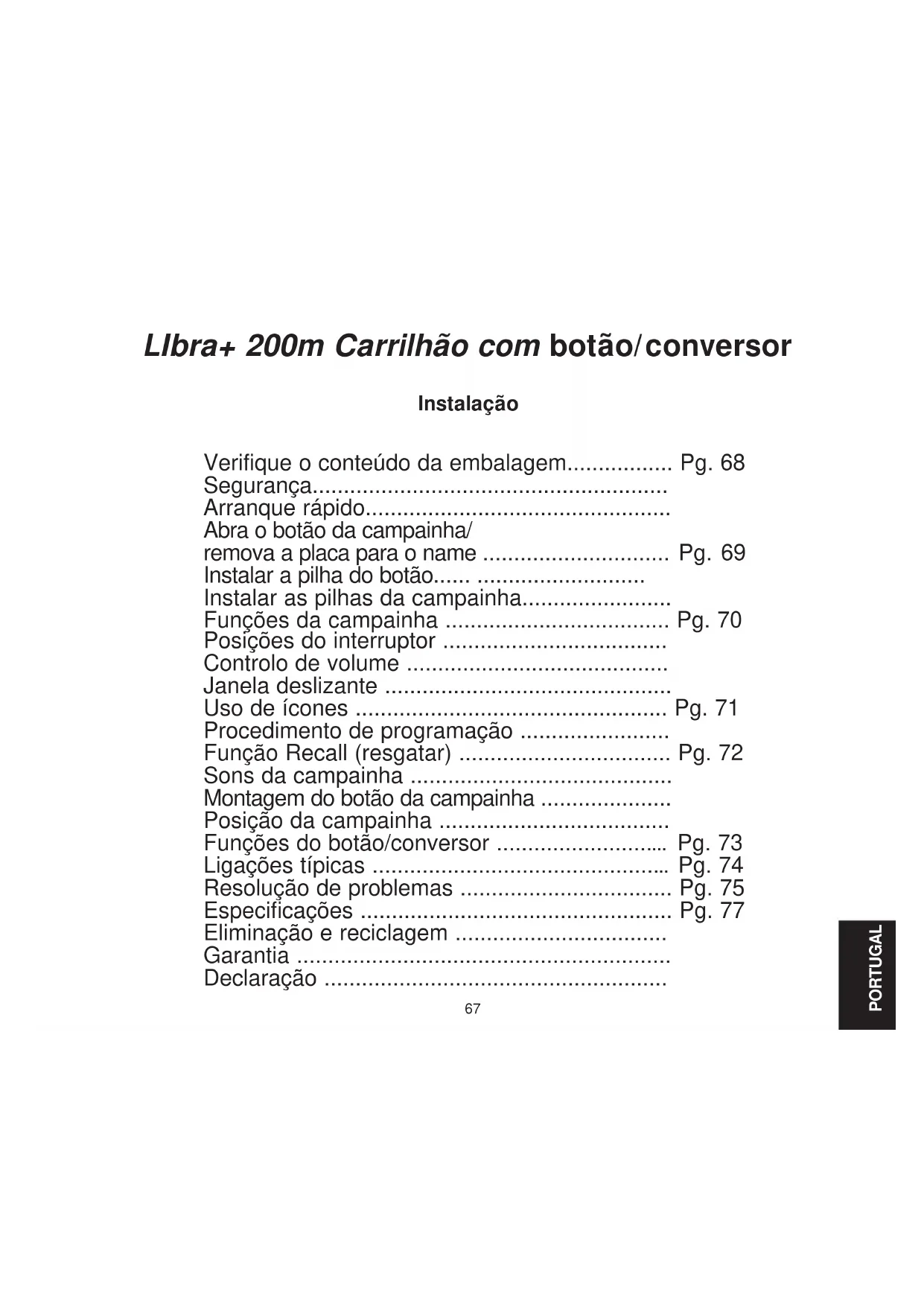 LR14 12 mesi IP3x D935,D935E67 LIbra+ 200m Carrilhão com botão/conversor Instalação Verifique o conteúdo da embalagem................. Pg. 68 Segurança......................................................... Arranque rápido................................................. Abra o botão da campainha/ remova a placa para o name .............................. Pg. 69 Instalar a pilha do botão...... ........................... Instalar as pilhas da campainha........................ Funções da campainha .................................... Pg. 70 Posições do interruptor .................................... Controlo de volume .......................................... Janela deslizante .............................................. Uso de ícones .................................................. Pg. 71 Procedimento de programação ........................ Função Recall (resgatar) .................................. Pg. 72 Sons da campainha .......................................... Montagem do botão da campainha ..................... Posição da campainha ..................................... Funções do botão/conversor ............................ Pg. 73 Ligações típicas ................................................ Pg. 74 Resolução de problemas .................................. Pg. 75 Especificações .................................................. Pg. 77 Eliminação e reciclagem .................................. Garantia ............................................................ Declaração ....................................................... PORTUGAL68 LIbra+ 200m Campainha com botão/conversor Obrigado por ter escolhido este produto Friedland. De modo a garantir a instalação e a utilização correctas, siga as seguintes instruções e guarde-as num local seguro para posterior consulta. Retire o kit de campainha da embalagem e confirme a existência das seguintes peças: ● Campainha ● Suporte da campainha ● Botão/conversor ● Pilha tipo CR2032 para o botão da campainha ● Fio da campainha (para utilização com botão com fio) ● 2 x parafusos de montagem do botão ● 2 x parafusos de montagem da campainha ● 2 x buchas ● Fitas autocolantes Irá precisar de: ● Uma chave de estrela de 4mm ● Uma chave-de-fendas pequena ● 4 x pilhas alcalinas tipo LR14 ‘C’, ● Uma broca para furar pedra de 6 mm Verifique o conteúdo da embalagem Segurança Antes de continuar com a instalação, esteja atento às seguintes normass de segurança: ● Cumpra sempre as recomendações de segurança do fabricante quando utilizar ferramentas eléctricas e use equipamento de protecção adequado (ex.: óculos de segurança) quando estiver a furar, etc. ● Antes de começar a furar a parede, verifique se existem cabos eléctricos ou tubagens de água. Em caso de dúvida, recomenda-se a utilização de um dispositivo de detecção de cabos/tubos. ● Quando ligar o botão/conversor horizontal a equipamentos de outras marcas, consulte os manuais e, caso necessário, contacte o fabricante relativamente à adequabilidade do uso pretendido. O botão fornecido com este kit está programado para funcionar com a campainha Para começar, terá de proceder do seguinte modo. ● Abra o botão da campainha ● Instale a pilha do botão ● Instale as pilhas da campainha ● Verifique a posição do interruptor da campainha ● Verifique o ajuste de volume Ao premir o botão, a campainha toca e o 1º ícone pisca. Se possuir mais botões, ou quiser atribuir um ícone diferente ao botão, terá de proceder à respectiva programação. Arranque rápido69 Instalar a pilha do botão Fig. 2 CR2032