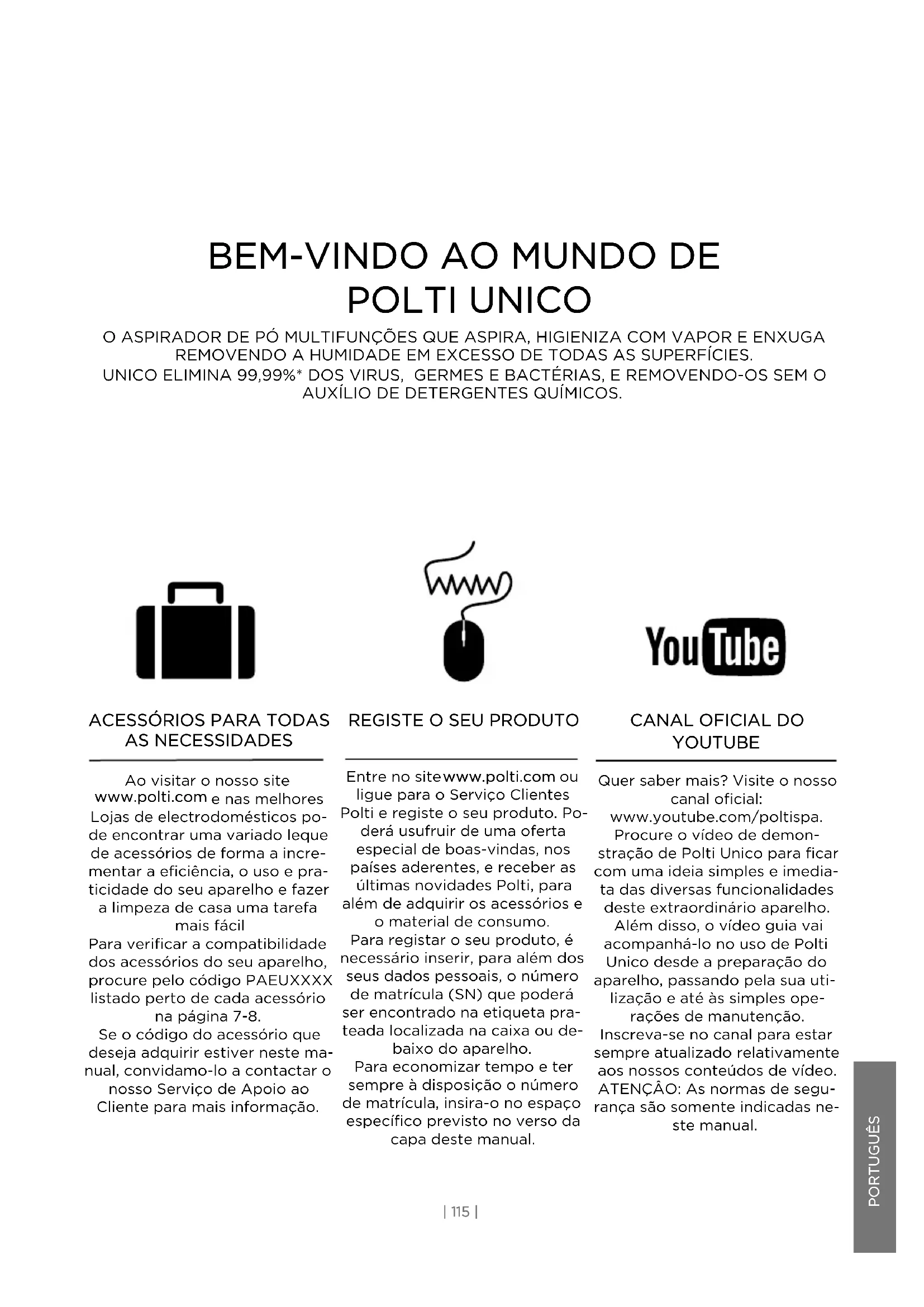 YOUTUBE Quer saber mais? Visite o nosso canal oficial: www.youtube.com/poltispa. Procure o vídeo de demon- stração de Polti Unico para ficar com uma ideia simples e imedia- ta das diversas funcionalidades deste extraordinário aparelho. Além disso, o vídeo guia vai acompanhá-lo no uso de Polti Unico desde a preparação do aparelho, passando pela sua uti- lização e até às simples ope- rações de manutenção. Inscreva-se no canal para estar sempre atualizado relativamente aos nossos conteúdos de vídeo. ATENÇÂO: As normas de segu- rança são somente indicadas ne- ste manual. | 115 | PORTUGUÊS| 116 | PORTUGUÊS