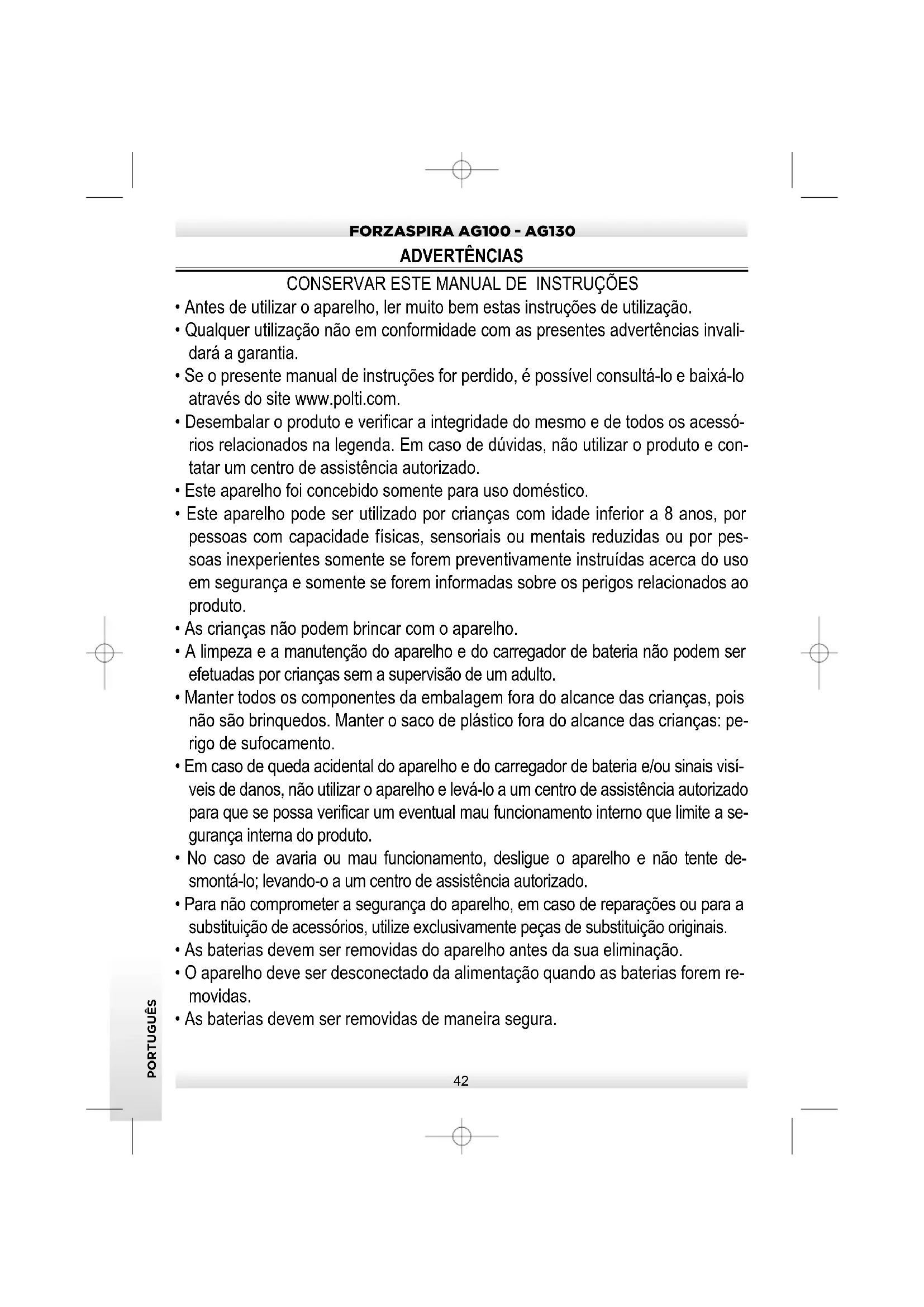 PORTUGUÊS ADVERTÊNCIAS DE SEGURANÇA : Risco de descargas elétricas e/ou de curto-circuito: - O carregador de bateria serve para carregar as baterias dentro do aparelho. Não utilizar o aparelho com o carregador de bateria ligado. - A instalação elétrica à qual o carregador de bateria será ligado deve estar em conformidade com as leis em vigor. - Antes de ligar o carregador de bateria, assegure-se de que a tensão de rede cor- responde à indicada nos dados da placa de identificação. - Se o carregador de bateria permanecer algum tempo sem ser usado, recomen- damos que a ficha seja desligada da rede elétrica. - Antes de efetuar qualquer operação de manutenção, desligar sempre o apa- relho. - Não desconectar o cabo de alimentação do carregador de bateria puxando-o, mas retirar a ficha para evitar danos na tomada. - Não torcer, pisar ou esticar o cabo de alimentação do carregador de bateria nem colocá-lo em contacto com superfícies cortantes ou aquecidas. - Não utilizar o carregador de bateria se o cabo de alimentação ou outras partes importantes do aparelho estiverem danificados. Contactar um centro de assi- stência autorizado. - Se o carregador de bateria com o respetivo cabo estiver visivelmente danificado, substitua-o imediatamente com uma peça de substituição Polti. Não tentar re- pará-lo de nenhuma forma. - Não utilizar extensões elétricas não autorizadas pelo fabricante que possam causar danos ou incêndios. - Nunca tocar no carregador de bateria com as mãos ou os pés molhados en- quanto a ficha estiver inserida. - Não usar o carregador de bateria com os pés descalços. - Não utilizar o carregador de bateria perto de lavatórios, banheiras, duches ou re- cipientes cheios de água. - Nunca mergulhar o aparelho, o cabo ou as fichas em água ou noutros líquidos.FORZASPIRA AG100 - AG130