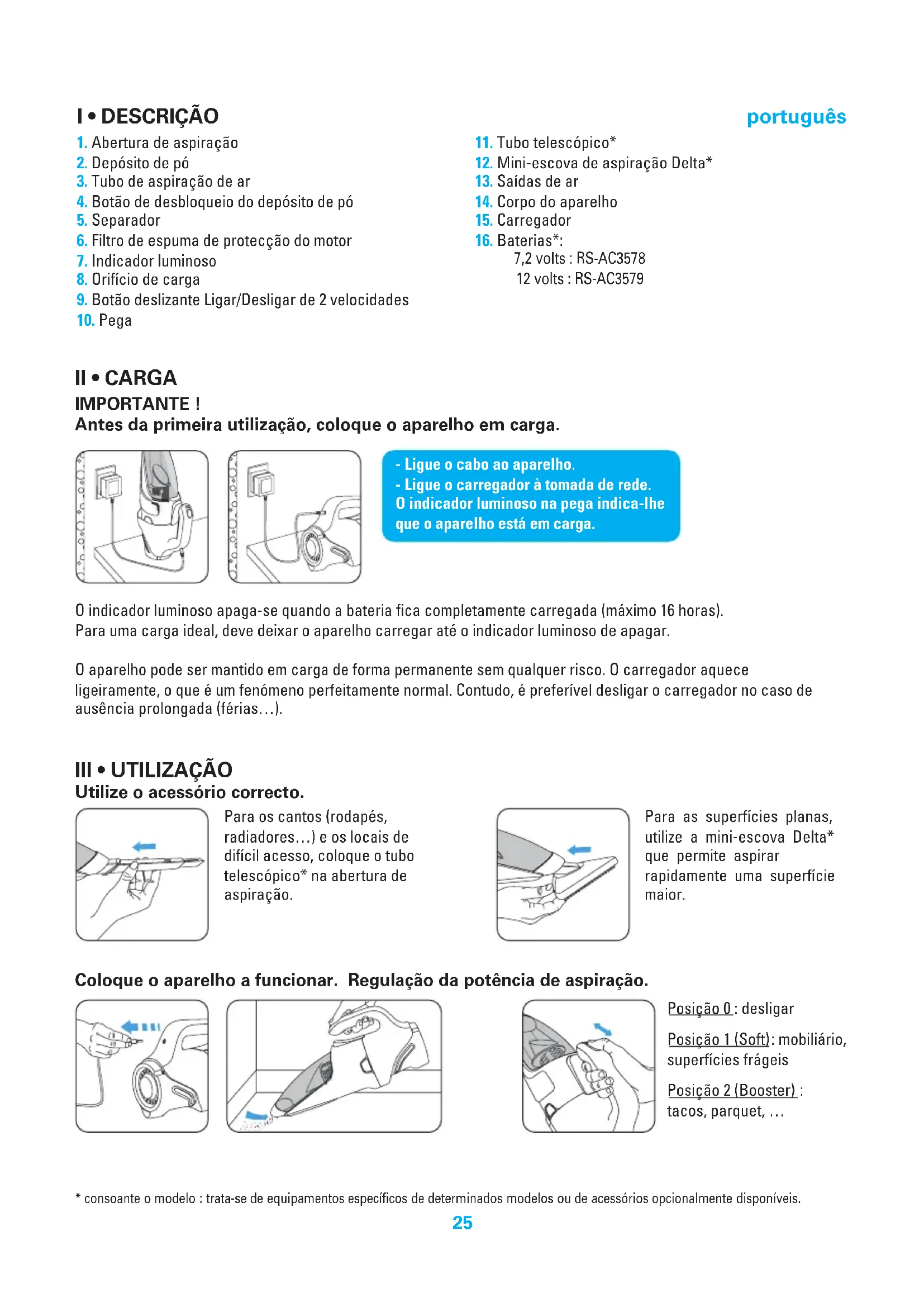 - consoante o modelo : trata-se de equipamentos específicos de determinados modelos ou de acessórios opcionalmente disponíveis. Para as superfícies planas, utilize a mini-escova Delta* que permite aspirar rapidamente uma superfície maior. - Ligue o cabo ao aparelho. - Ligue o carregador à tomada de rede. O indicador luminoso na pega indica-lhe que o aparelho está em carga.