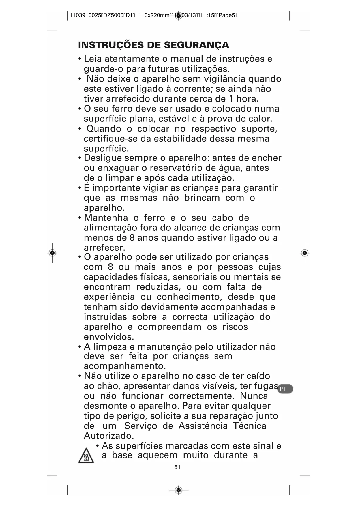 - As superfícies marcadas com este sinal e a base aquecem muito durante a 1103910025DZ5000D1_110x220mm15/03/1311:15Page5152 utilização dos aparelhos. Não toque nestas superfícies antes do ferro arrefecer completamente.