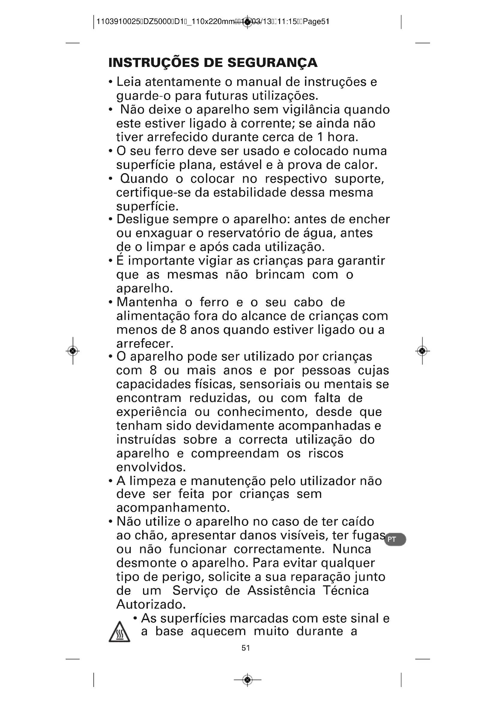 - As superfícies marcadas com este sinal e a base aquecem muito durante a 1103910025DZ5000D1_110x220mm15/03/1311:15Page5152 utilização dos aparelhos. Não toque nestas superfícies antes do ferro arrefecer completamente.