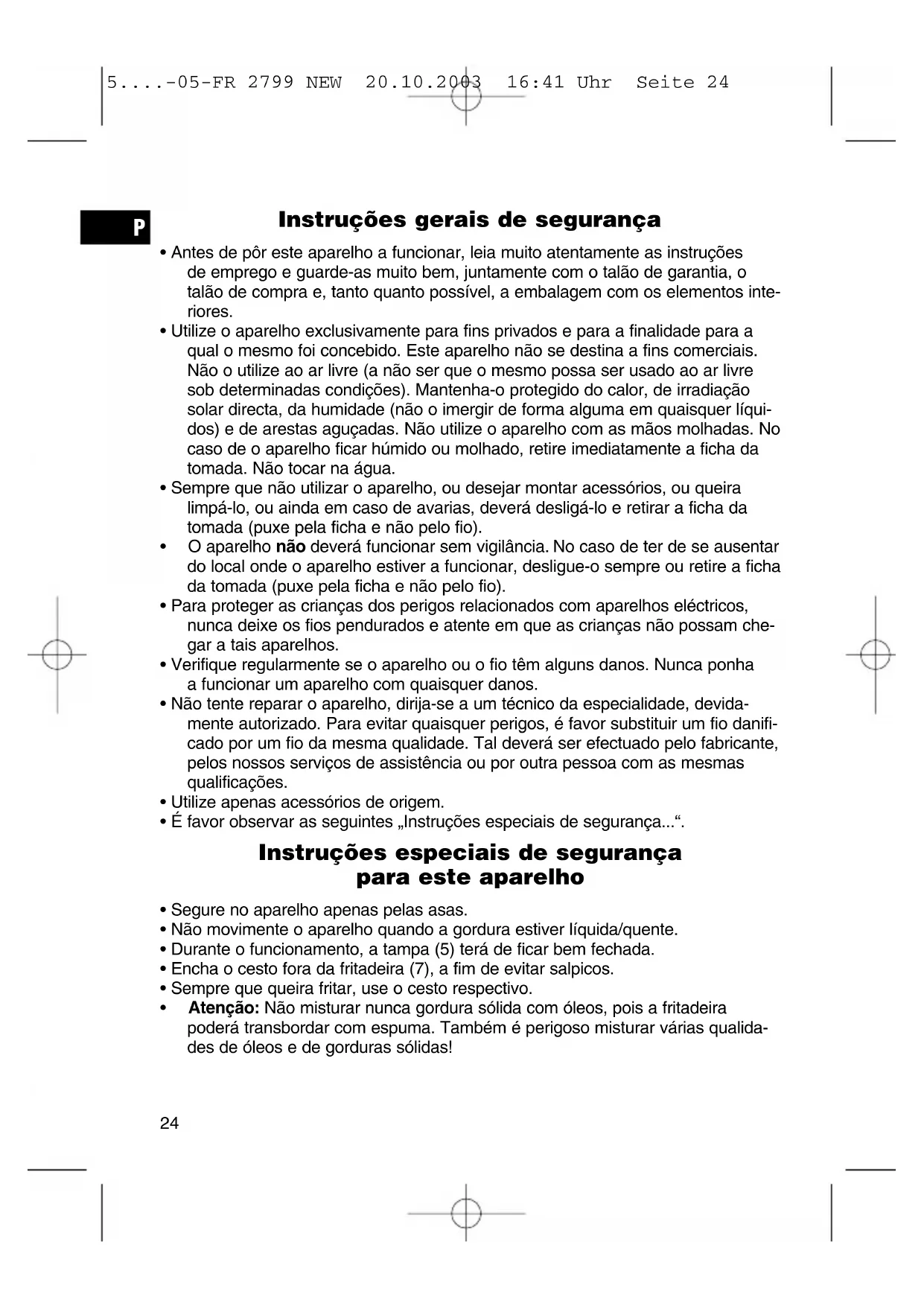 5....-05-FR 2799 NEW 20.10.2003 16:41 Uhr Seite 24• No caso de o aparelho começar a arder, não tente, de forma alguma, apagar o fogo com água. Feche a tampa do aparelho. Abafe as chamas com um pano húmido. Introdução Esta fritadeira dispõe de um termostato regulável para que a temperatura possa ser adaptada individualmente aos alimentos. É favor ler estas instruções com toda a atenção para poder utilizar o aparel- ho da melhor maneira e com a máxima segurança. Ligação O aparelho terá de ser ligado a uma tomada com protecção de contactos de 230 V, 50 Hz, devidamente instalada. Funcionamento Antes da primeira utilização