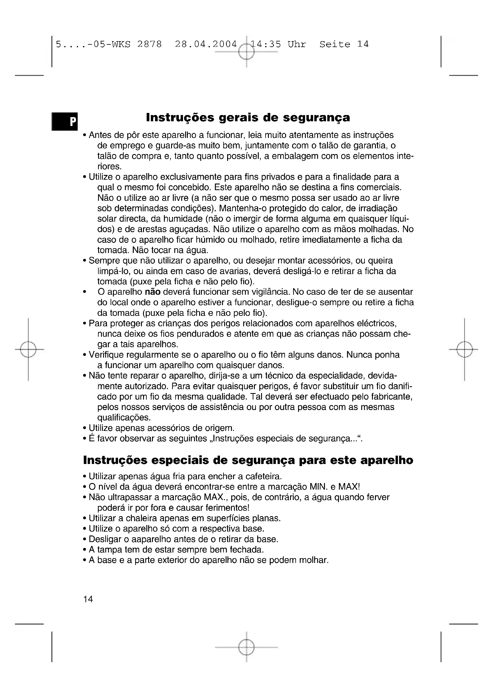 5....-05-WKS 2878 28.04.2004 14:35 Uhr Seite 14Primeira utilização Leia por favor estas instruções com toda a atenção e guarde-as num sítio seguro. Antes da primeira utilização, deverá ferver-se água duas vezes; é favor usar apen- as água sem quaisquer aditivos. Funcionamento