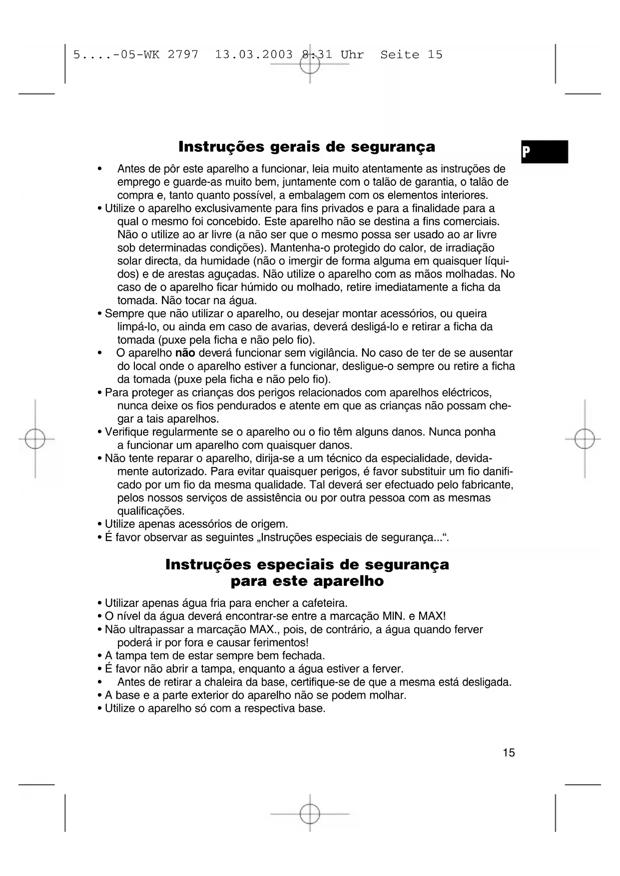 5....-05-WK 2797 13.03.2003 8:31 Uhr Seite 15Primeira utilização Leia por favor estas instruções com toda a atenção e guarde-as num sítio seguro. Antes da primeira utilização, deverá ferver-se água duas vezes; é favor usar apen- as água sem quaisquer aditivos. Funcionamento
