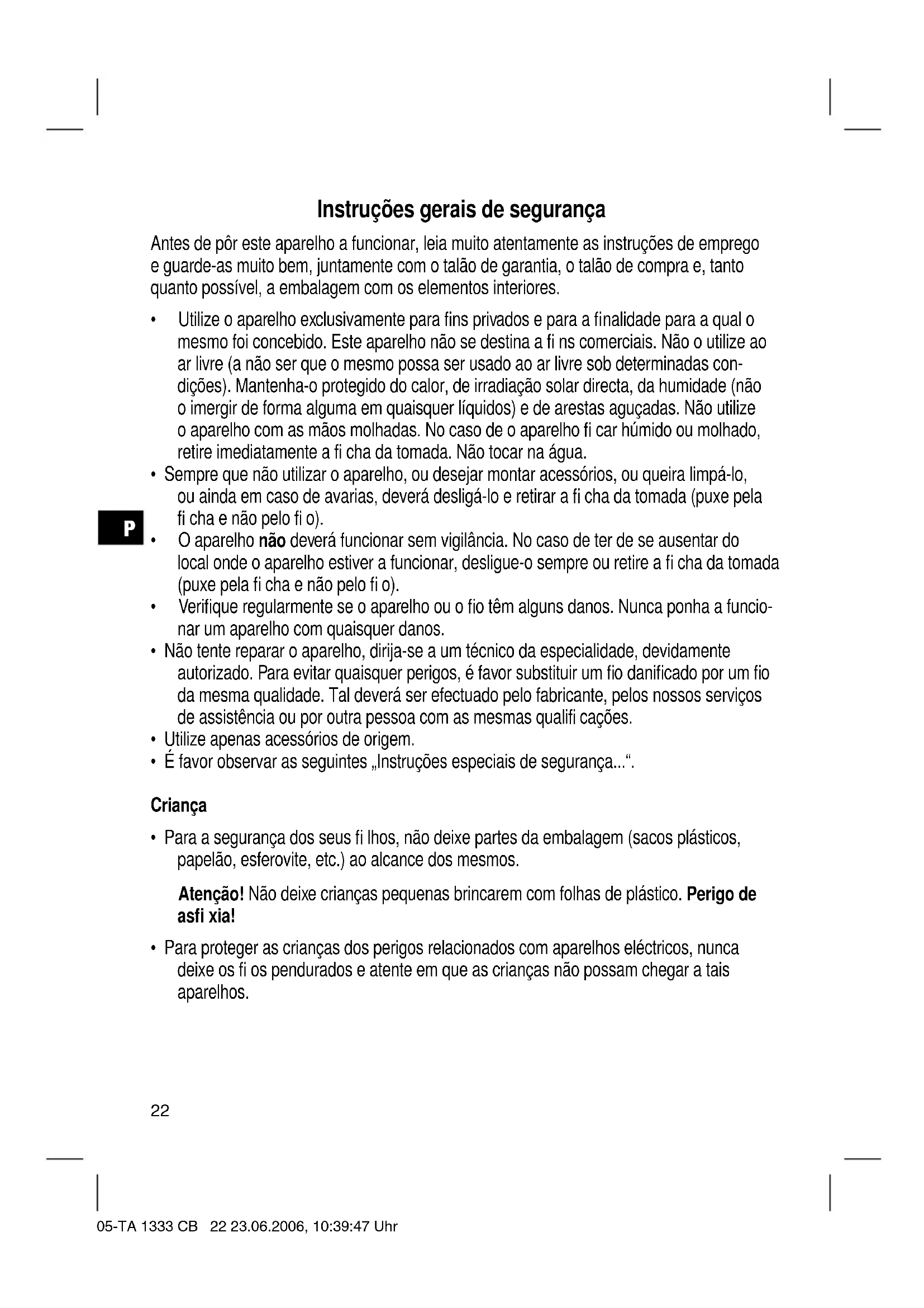 - Para proteger as crianças dos perigos relacionados com apareiros electricos, nunca deixe os fi os pendurados e atente em que as crianças não possam chegar a tais apareiros.