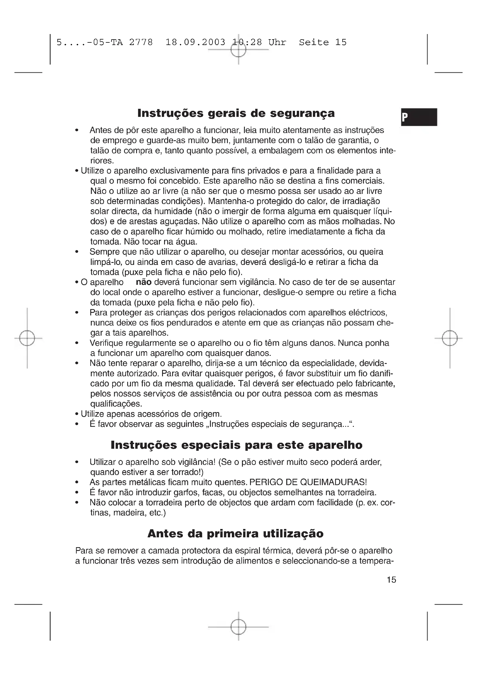 5....-05-TA 2778 18.09.2003 10:28 Uhr Seite 16• Retire a gaveta das migalhas, deite fora os restos de pão e torne a colocá-la no respectivo lugar. Este aparelho foi controlado nos termos das actuais directivas da CEE aplicáveis, tais como inocuidade electromagnética e directiva sobre baixa tensão, e fabricado de acordo com as mais novas prescrições da segurança técnica. Reserva-se o direito de alterações! Garantia O aparelho vendido pela nossa empresa tem uma garantia de 24 meses a partir da data da compra (talão). Durante o período de garantia, procederemos à remoção grátis - por reparação, ou, segundo a nossa decisão, por substituição - das deficiências do aparelho ou dos acessórios*) que provenham de erros de material ou de fabricação. A pre- stação de serviços relacionados com a garantia não prolongarão a mesma, nem iniciarão um novo prazo de garantia! O talão de compra consistirá prova desta garantia. Sem o mesmo, não será pos- sível proceder-se a qualquer troca ou reparação grátis. Em caso de garantia, entregue o aparelho completo, juntamente com o talão de compra, na loja onde o mesmo foi comprado. *) No caso de danos em quaisquer acessórios, não será efectuada automática- mente uma substituição completa do aparelho. Contacte neste caso a nossa hotli- ne! Danos causados por quebras de peças de vidro ou de plástico terão de ser pagos pelo cliente! Não estão incluídos na garantia quaisquer defeitos de acessórios ou de peças que se desgastem (como, por exemplo, carvões do motor, varinhas, correias do motor, telecomandos, escovas de dentes, folhas de serra, etc.), nem a limpeza, a manu- tenção ou a substituição de peças que se desgastem, devendo tais despesas ser reembolsadas! A garantia terminará sempre que tenha havido intervenção alheia nos aparelhos. Após a garantia Após a expiração do prazo de garantia, poderão ser efectuados arranjos por pes- soal especializado, ou pelos nossos serviços de reparações, contra reembolso.