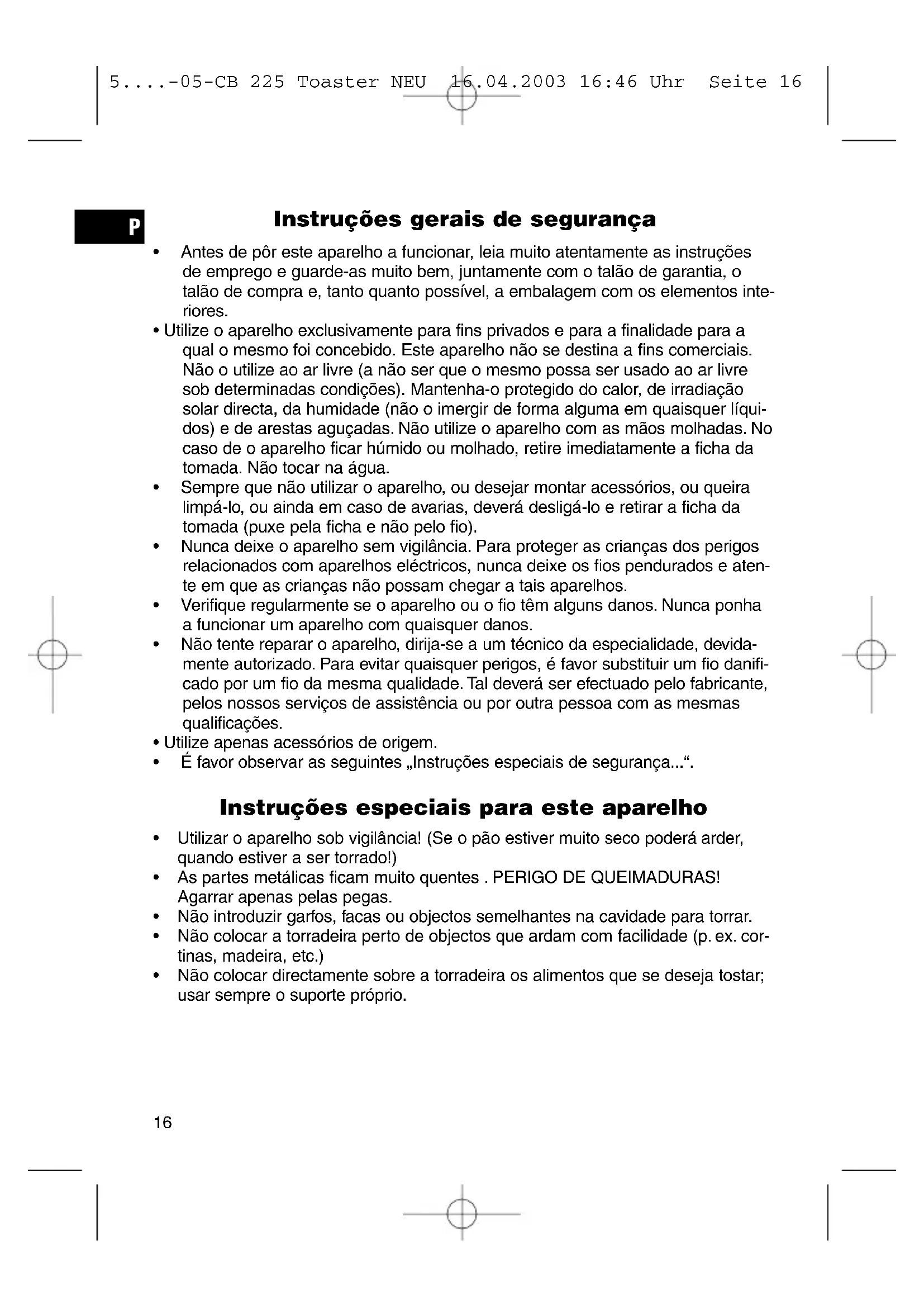 - É favor observar as seguintes „Instruções especiais de segurança...“. Instruções especiais para este aparelho