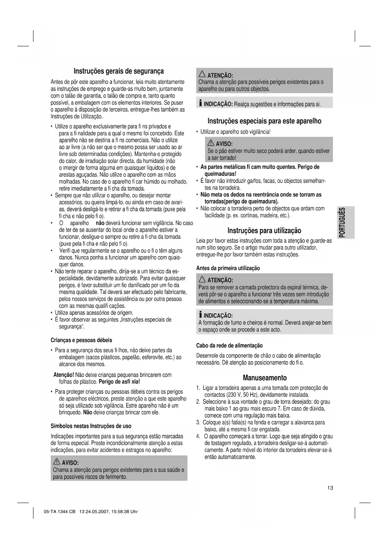 - Para proteger crianças ou pessoas débeis contra os perigos de aparelhos eléctricos, preste atenção a que este aparelho só seja utilizado sob vigilância. Estre aparelho não é um brinquedo. Não deixe crianças brincar com ele. Símbolos nestas Instruções de uso Indicações importantes para a sua segurança estão marcadas de forma especial. Preste incondicionalmente atenção a estas indicações, para evitar acidentes e estragos no aparelho: AVISO: Chama a atenção para perigos existentes para a sua saúde e para possíveis riscos de ferimento. ATENÇÃO: Chama a atenção para possíveis perigos existentes para o aparelho ou para outros objectos. INDICAÇÃO: Realça sugestões e informações para si. Instruções especiais para este aparelho