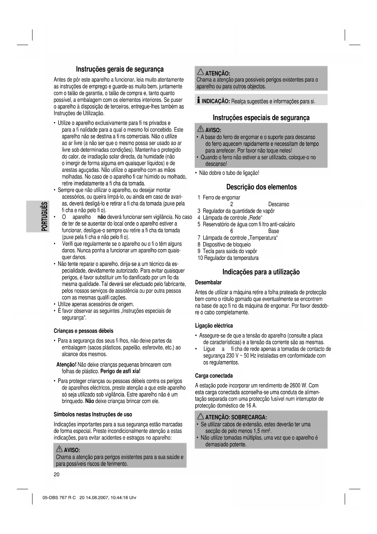 - Para proteger crianças ou pessoas débeis contra os perigos de aparelhos eléctricos, preste atenção a que este aparelho só seja utilizado sob vigilância. Estre aparelho não é um brinquedo. Não deixe crianças brincar com ele. Símbolos nestas Instruções de uso Indicações importantes para a sua segurança estão marcadas de forma especial. Preste incondicionalmente atenção a estas indicações, para evitar acidentes e estragos no aparelho: AVISO: Chama a atenção para perigos existentes para a sua saúde e para possíveis riscos de ferimento. ATENÇÃO: Chama a atenção para possíveis perigos existentes para o aparelho ou para outros objectos. INDICAÇÃO: Realça sugestões e informações para si. Instruções especiais de segurança AVISO: