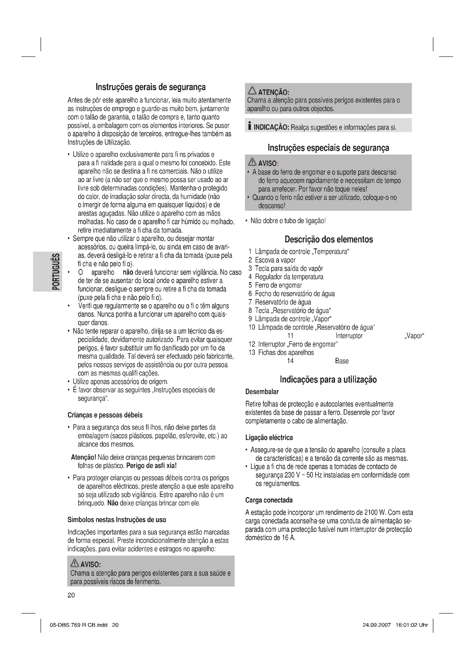 - Ligue a fi cha de rede apenas a tomadas de contacto de segurança 230 V ~ 50 Hz instaladas em conformidade com os regulamentos. Carga conectada A estação pode incorporar um rendimento de 2100 W. Com esta carga conectada aconselha-se uma conduta de alimentação se- parada com uma protecção fusível num interruptor de protecção doméstico de 16 A. 05-DBS 769 R CB.indd 2005-DBS 769 R CB.indd 20 24.09.2007 16:01:02 Uhr24.09.2007 16:01:02 Uhr21 PORTUGUÊS PORTUGUÊS ATENÇÃO: SOBRECARGA: