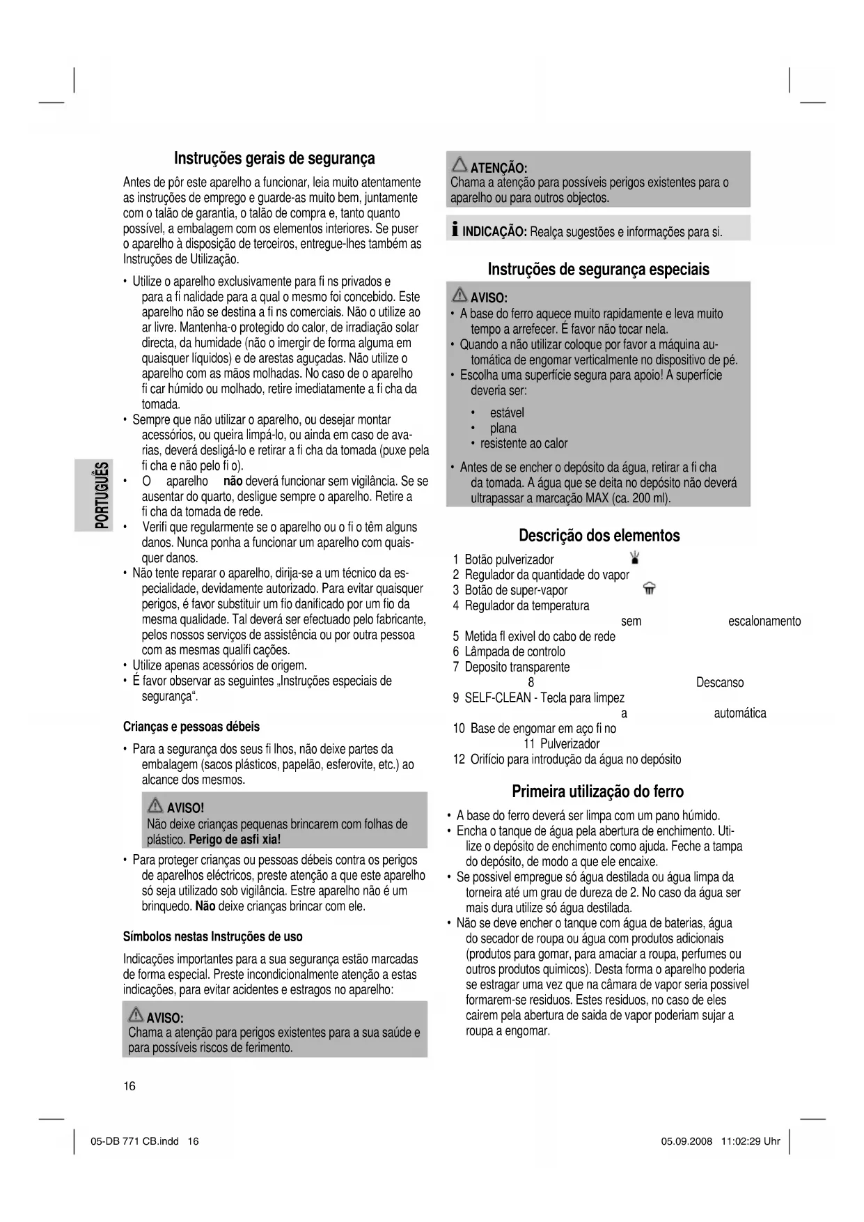 - Não se deve encher o tanque com água de baterias, água do secador de roupa ou água com produtos adicionais (produtos para gomar, para amaciar a roupa, perfumes ou outros produtos quimicos). Desta forma o aparelho poderia se estragar uma vez que na câmara de vapor seria possivel formarem-se residuos. Estes residuos, no caso de eles cairem pela abertura de saida de vapor poderiam sujar a roupa a engomar. 05-DB 771 CB.indd 1605-DB 771 CB.indd 16 05.09.2008 11:02:29 Uhr05.09.2008 11:02:29 Uhr17 PORTUGUÊS PORTUGUÊS Carga conectada O aparelho pode funcionar com uma capacidade de 2200 W. Com esta carga conectada aconselha-se uma conduta de ali- mentação separada com uma protecção fusível num interruptor de protecção doméstico de 16 A.