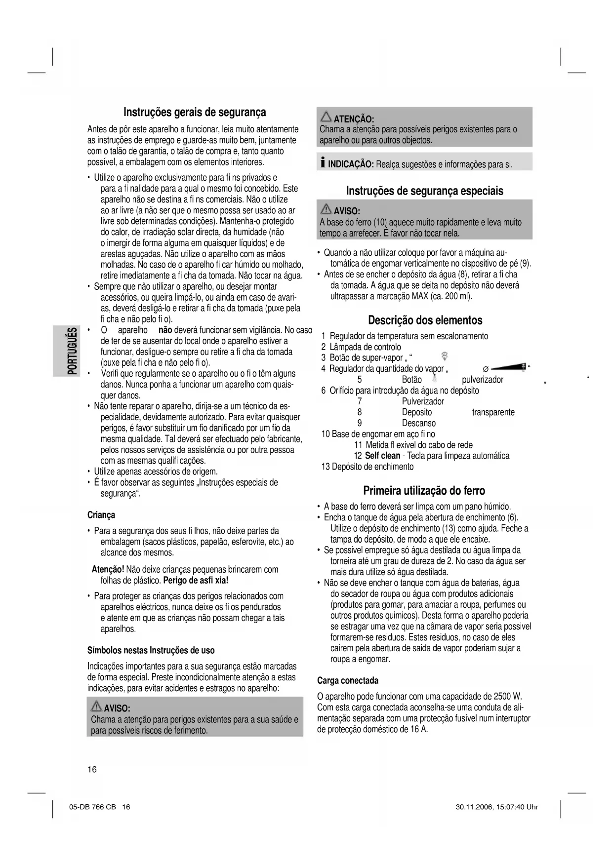 - Não se deve encher o tanque com água de baterias, água do secador de roupa ou água com produtos adicionais (produtos para gomar, para amaciar a roupa, perfumes ou outros produtos quimicos). Desta forma o aparelho poderia se estragar uma vez que na câmara de vapor seria possivel formarem-se residuos. Estes residuos, no caso de eles cairem pela abertura de saida de vapor poderiam sujar a roupa a engomar. Carga conectada O aparelho pode funcionar com uma capacidade de 2500 W. Com esta carga conectada aconselha-se uma conduta de ali- mentação separada com uma protecção fusível num interruptor de protecção doméstico de 16 A. 05-DB 766 CB 16 30.11.2006, 15:07:40 UhrPORTUGUÊS