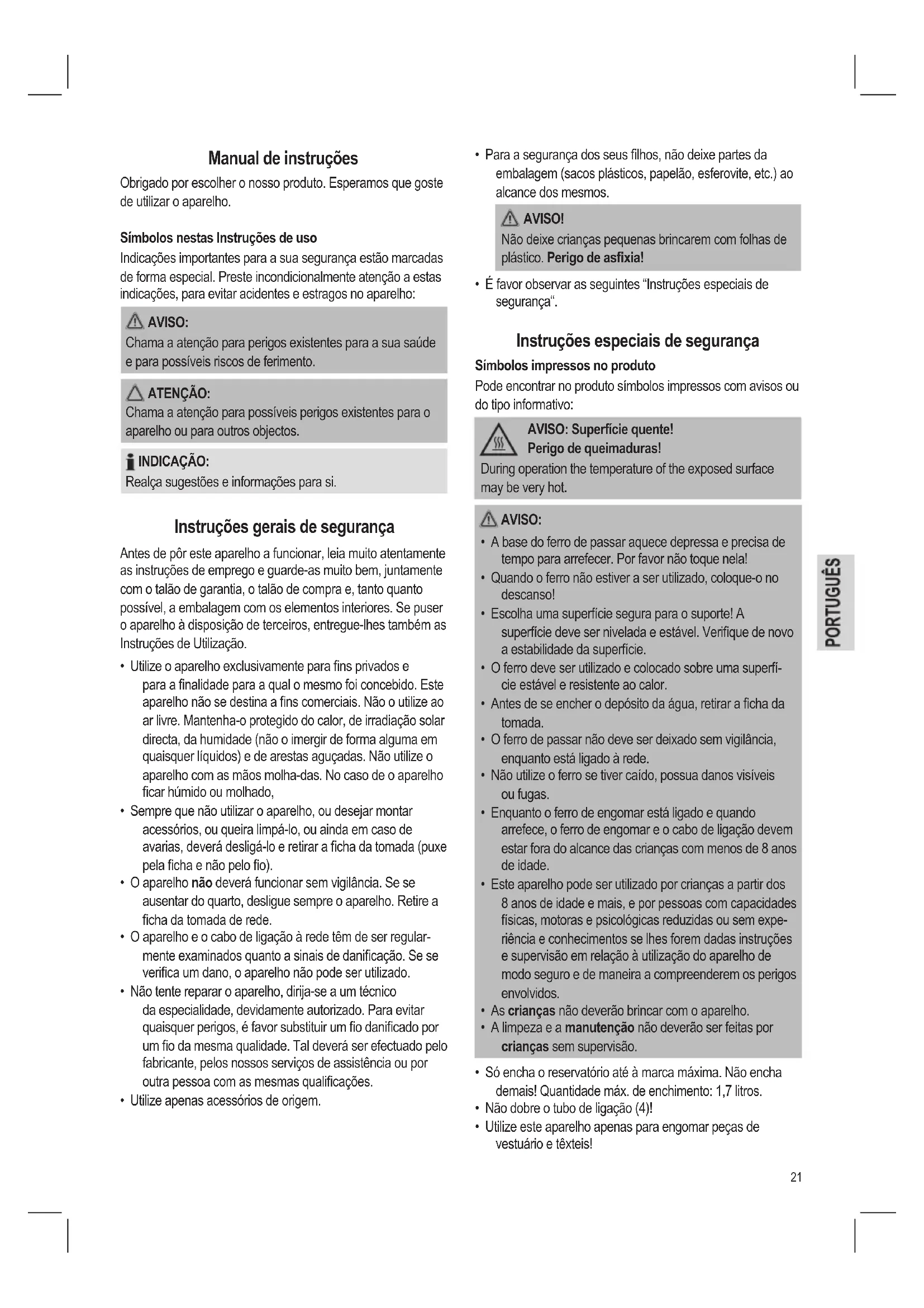 - Utilize este aparelho apenas para engomar peças de vestuário e têxteis! Manual de instruções Obrigado por escolher o nosso produto. Esperamos que goste de utilizar o aparelho. Símbolos nestas Instruções de uso Indicações importantes para a sua segurança estão marcadas de forma especial. Preste incondicionalmente atenção a estas indicações, para evitar acidentes e estragos no aparelho: AVISO: Chama a atenção para perigos existentes para a sua saúde e para possíveis riscos de ferimento. ATENÇÃO: Chama a atenção para possíveis perigos existentes para o aparelho ou para outros objectos. INDICAÇÃO: Realça sugestões e informações para si. Instruções gerais de segurança Antes de pôr este aparelho a funcionar, leia muito atentamente as instruções de emprego e guarde-as muito bem, juntamente com o talão de garantia, o talão de compra e, tanto quanto possível, a embalagem com os elementos interiores. Se puser o aparelho à disposição de terceiros, entregue-lhes também as Instruções de Utilização.