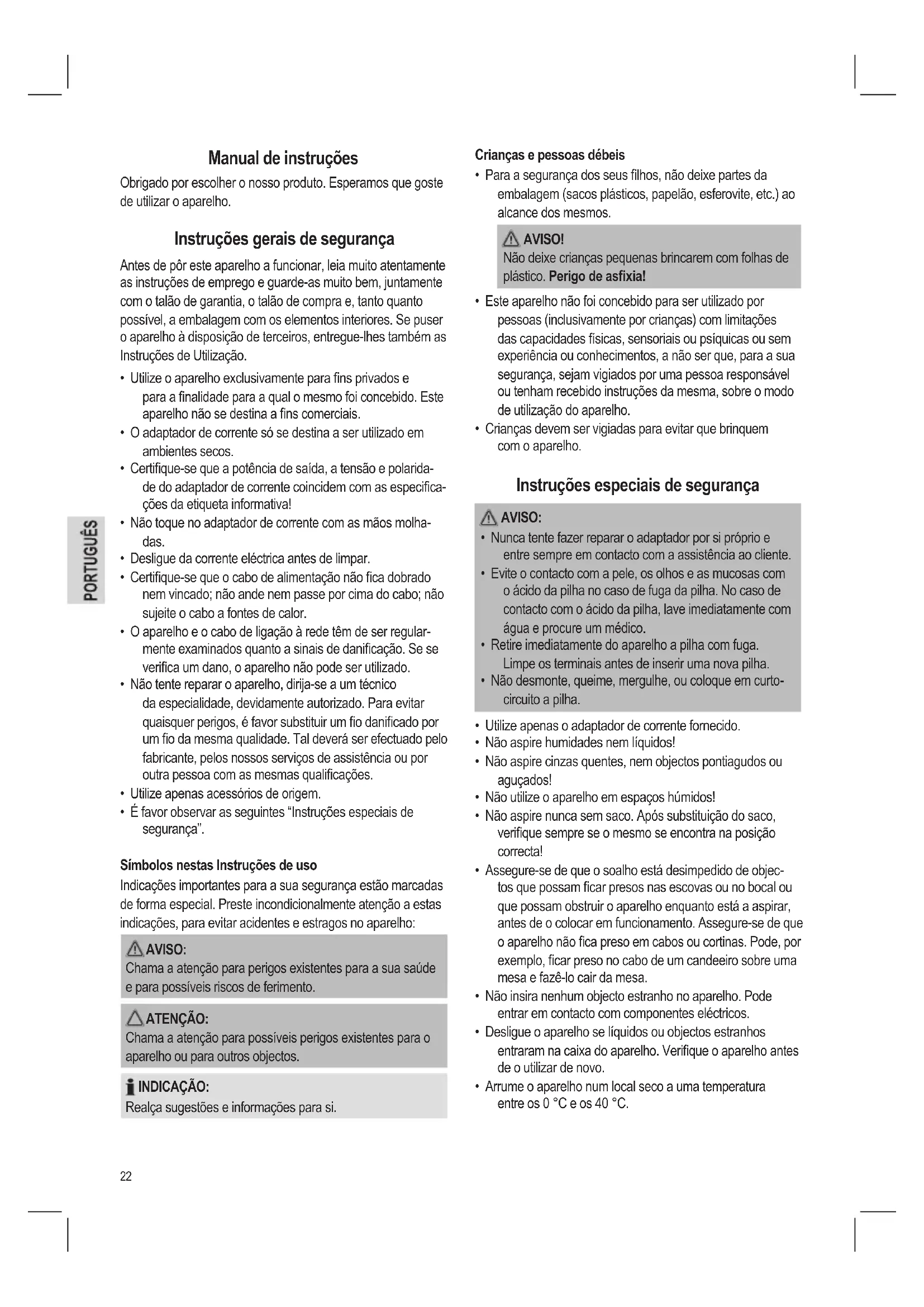 - É favor observar as seguintes “Instruções especiais de segurança”. Símbolos nestas Instruções de uso Indicações importantes para a sua segurança estão marcadas de forma especial. Preste incondicionalmente atenção a estas indicações, para evitar acidentes e estragos no aparelho: AVISO: Chama a atenção para perigos existentes para a sua saúde e para possíveis riscos de ferimento. ATENÇÃO: Chama a atenção para possíveis perigos existentes para o aparelho ou para outros objectos. INDICAÇÃO: Realça sugestões e informações para si. Crianças e pessoas débeis